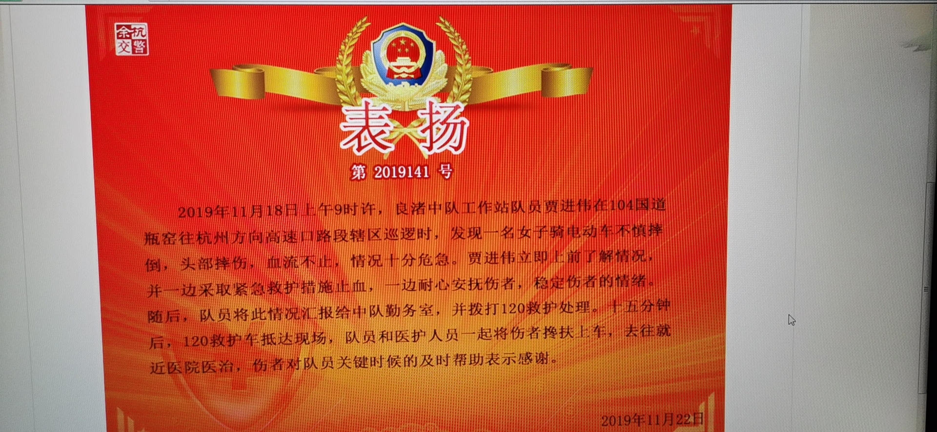 2019年11月18日,浙江民泰駐良渚交通輔警項目隊員賈進(jìn)偉救助騎車(chē)摔傷女子,受到良渚交警工作站公開(kāi)表?yè)P。