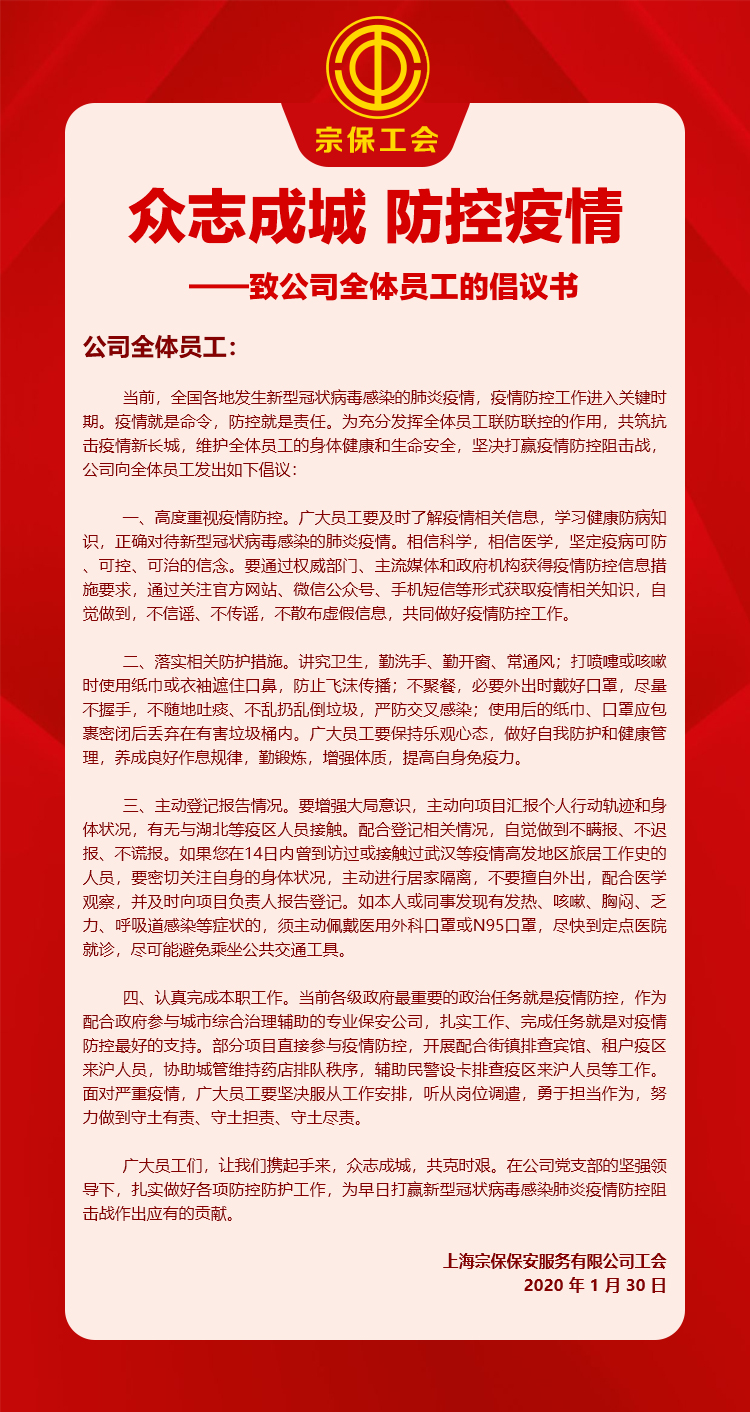 面對新型冠狀病毒感染的肺炎疫情形勢,宗保公司在各級黨委和政府的堅強領(lǐng)導下,在疫情權威部門(mén)的科學(xué)指導下,有信心有決心做好員工自身防護,積極參與疫情防控阻擊戰,讓客戶(hù)滿(mǎn)意放心,確保各項任務(wù)圓滿(mǎn)完成。