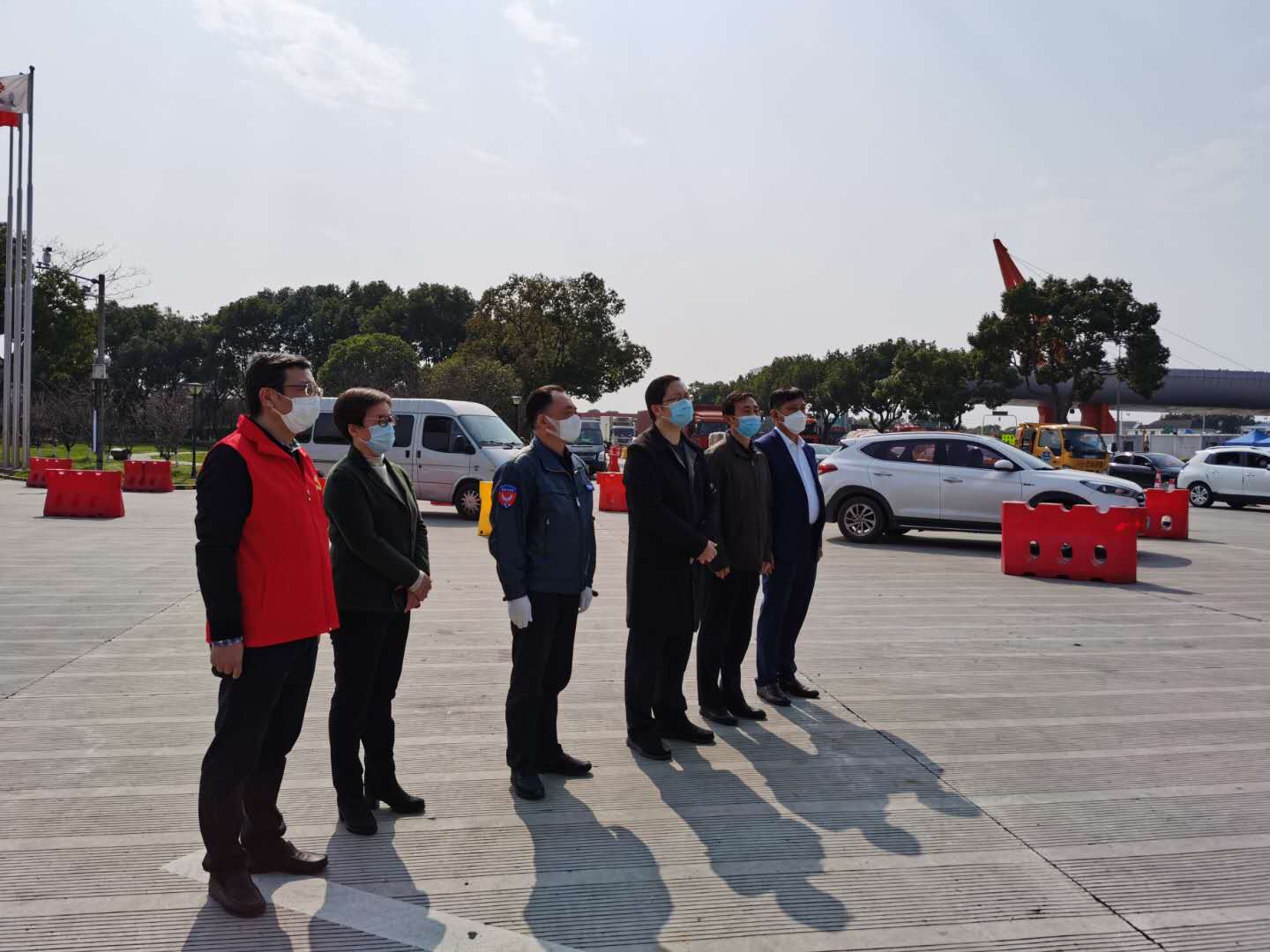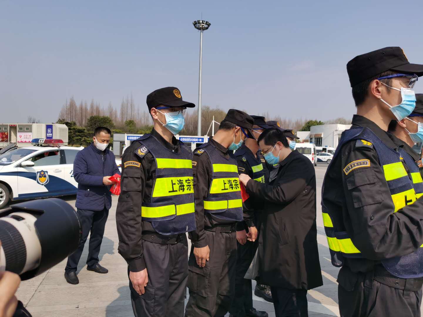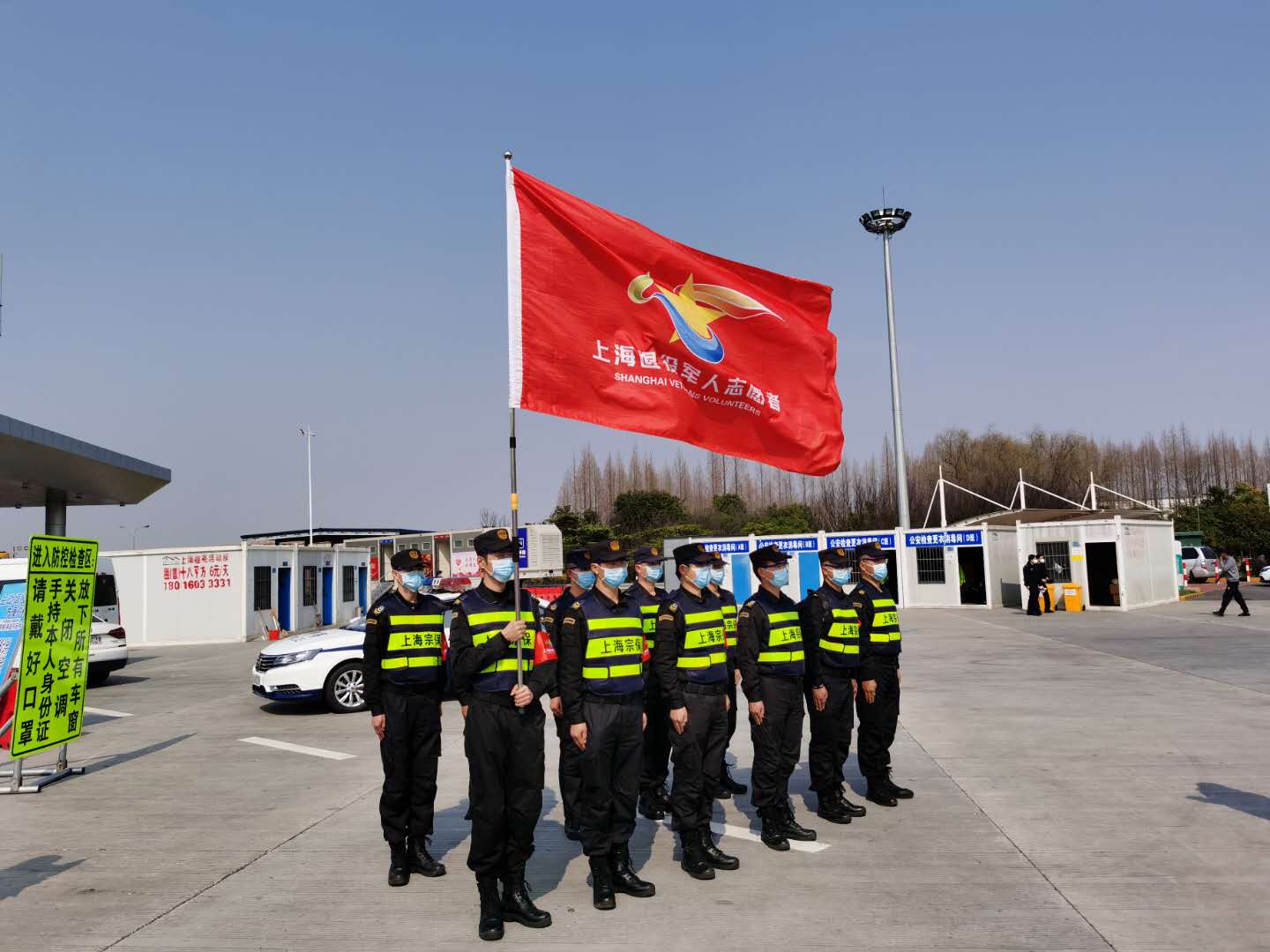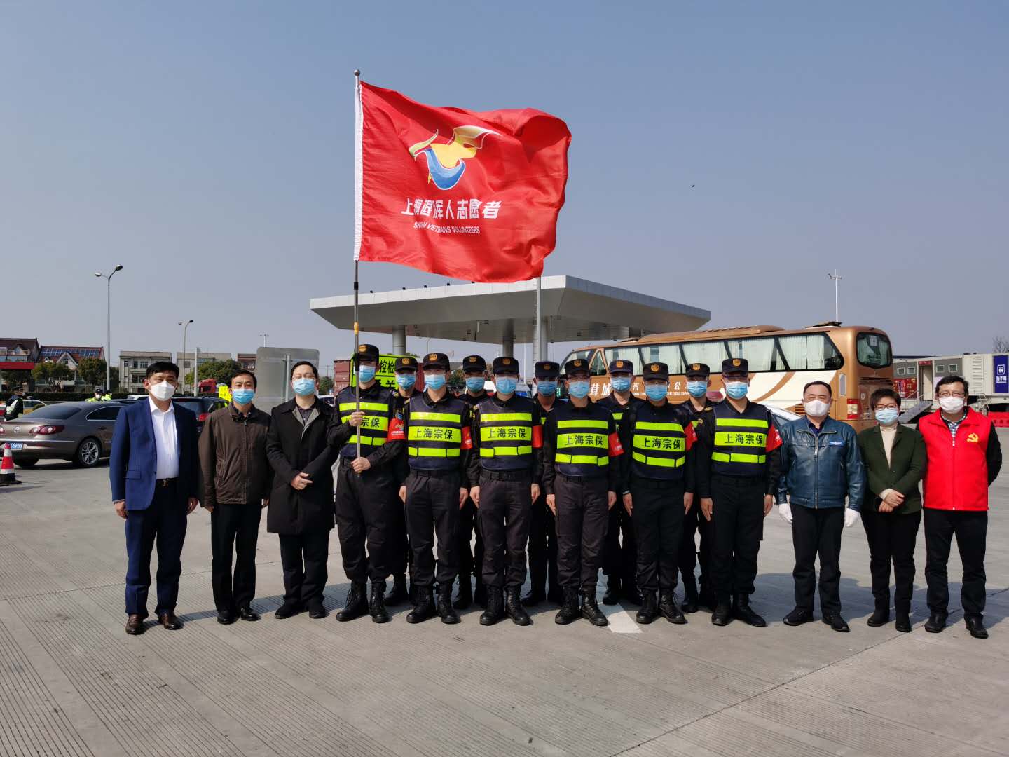2月25日13:20,宗保公司退役軍人突擊隊支援G60楓涇收費站疫情防控上崗儀式在收費站現場(chǎng)舉行。儀式由松江區退役軍人事務(wù)局局長(cháng)丁汀主持,市退役軍人事務(wù)局思想政治和權益維護處處長(cháng)龔平、松江區退役軍人事務(wù)局副局長(cháng)許方勇、佘山度假區管委會(huì )副主任葉軍、宗保公司總經(jīng)理晏軍等參加儀式。