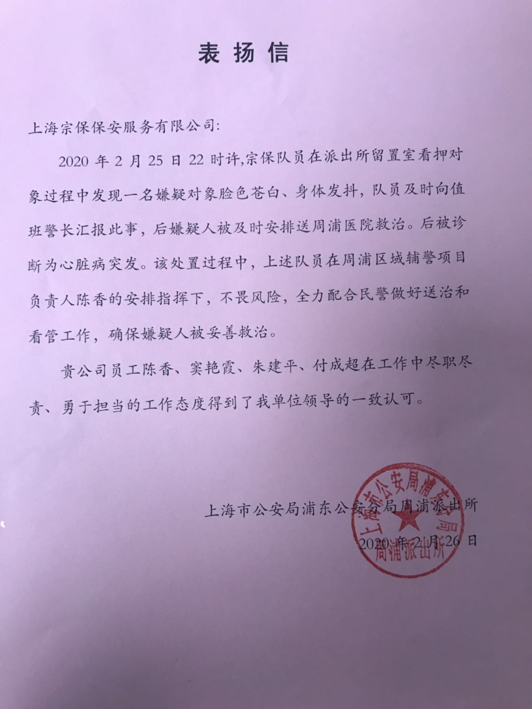 2月26日,宗保公司收到一封浦東公安分局周浦派出所送來(lái)的表?yè)P信,點(diǎn)名表?yè)P公司駐該所項目的陳香、竇艷霞、朱建平、付成超。