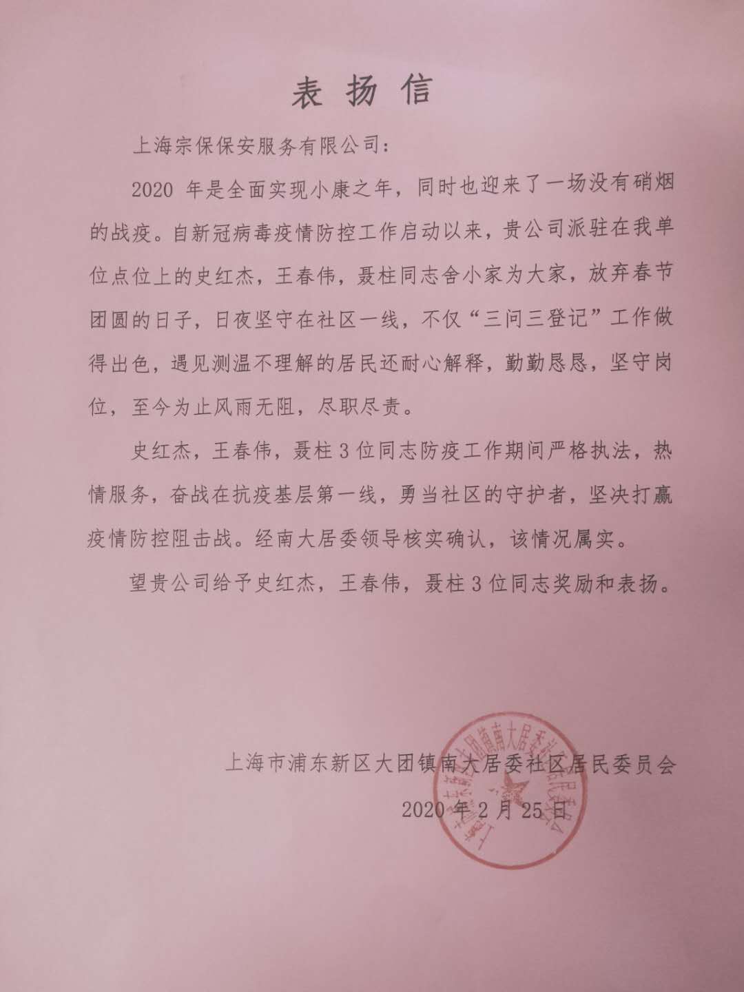 2月25日,宗保公司收到浦東新區大團鎮南大居委社區的表?yè)P信,表?yè)P公司駐大團項目的史紅杰、王春偉、聶柱三名隊員在疫情防控中的工作表現。