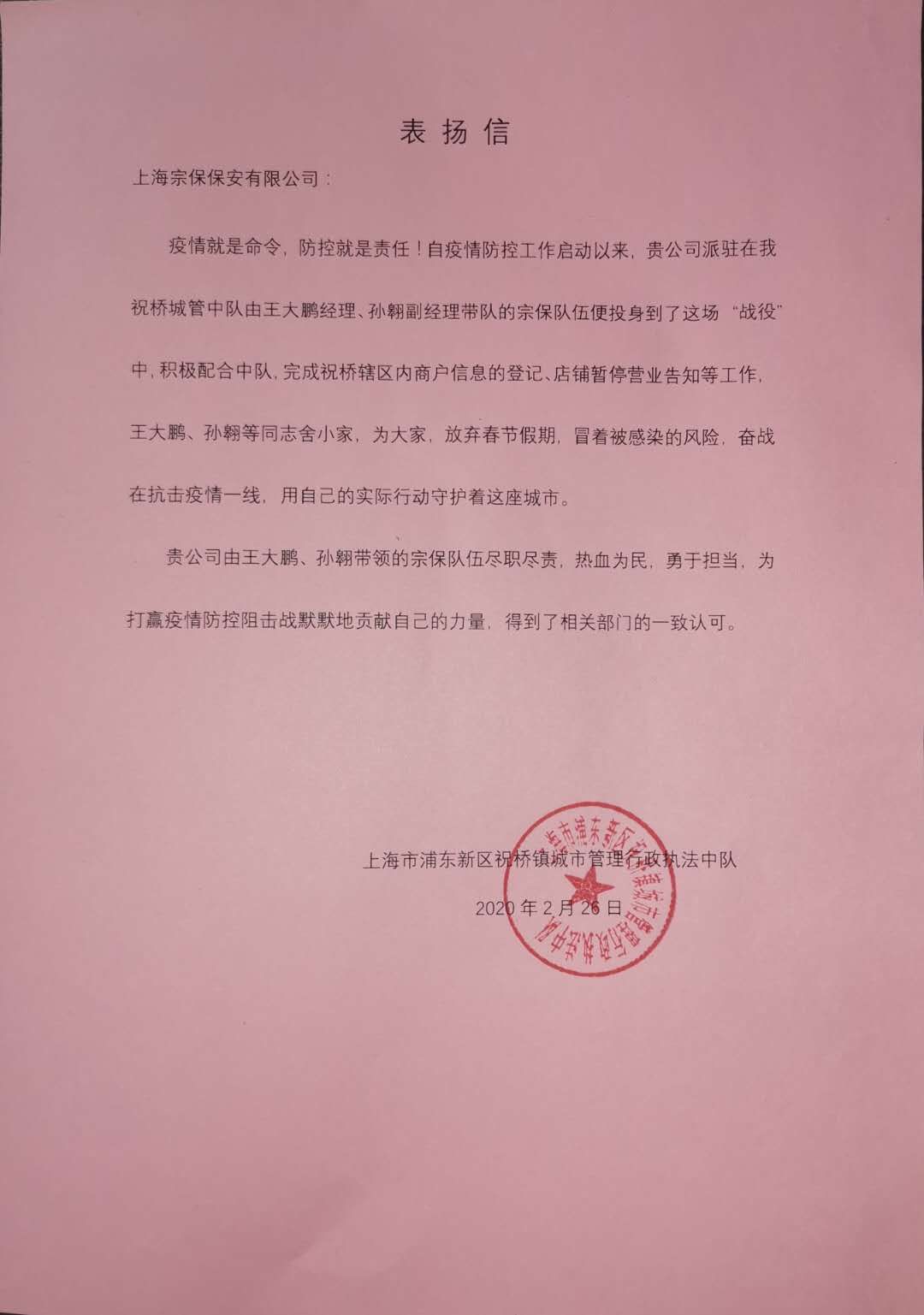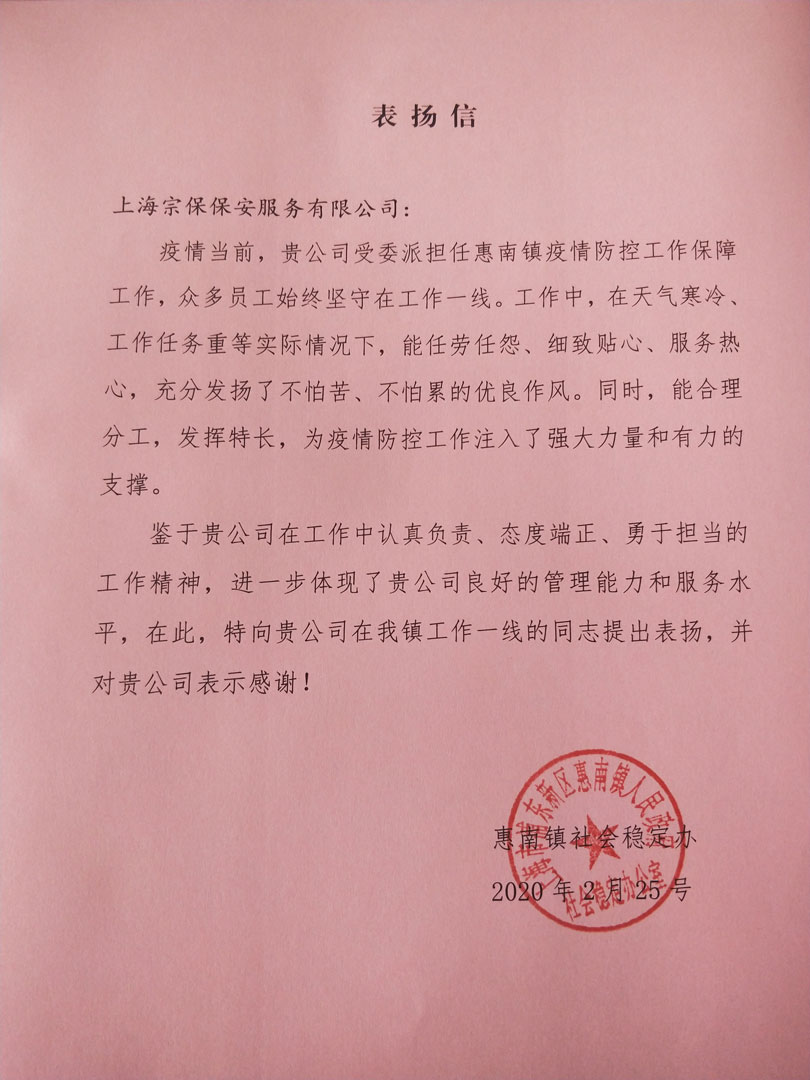 2月25日,浦東新區惠南鎮穩定辦送來(lái)表?yè)P信,表?yè)P宗保公司駐惠南市容項目全體隊員在疫情防控中認真負責、態(tài)度端正、勇于承擔的工作精神。