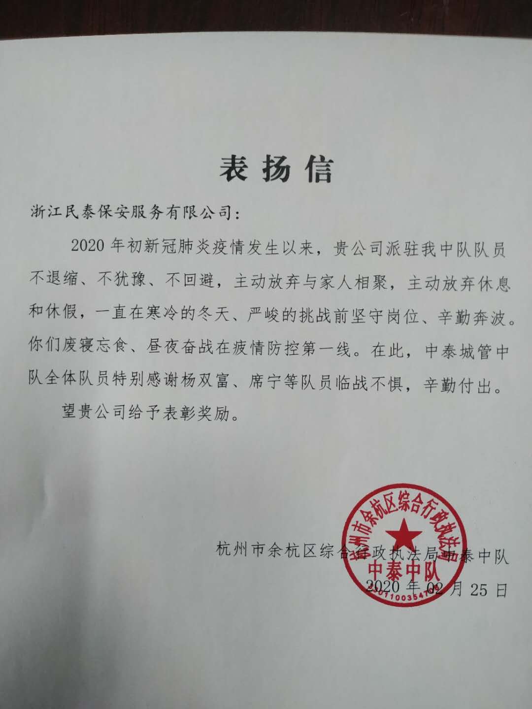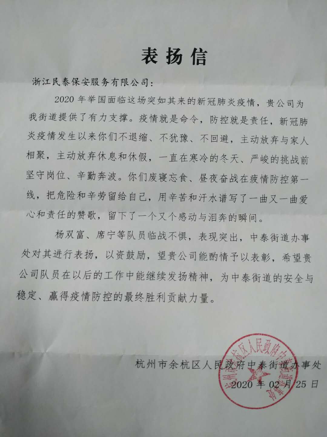 2月25日,杭州市余杭區中泰街道辦事處和該街道城管隊分別送來(lái)表?yè)P信,表?yè)P浙江民泰公司駐該街道城管項目全體隊員在疫情防控中的工作表現,點(diǎn)名表?yè)P楊雙富、席寧兩名隊員。