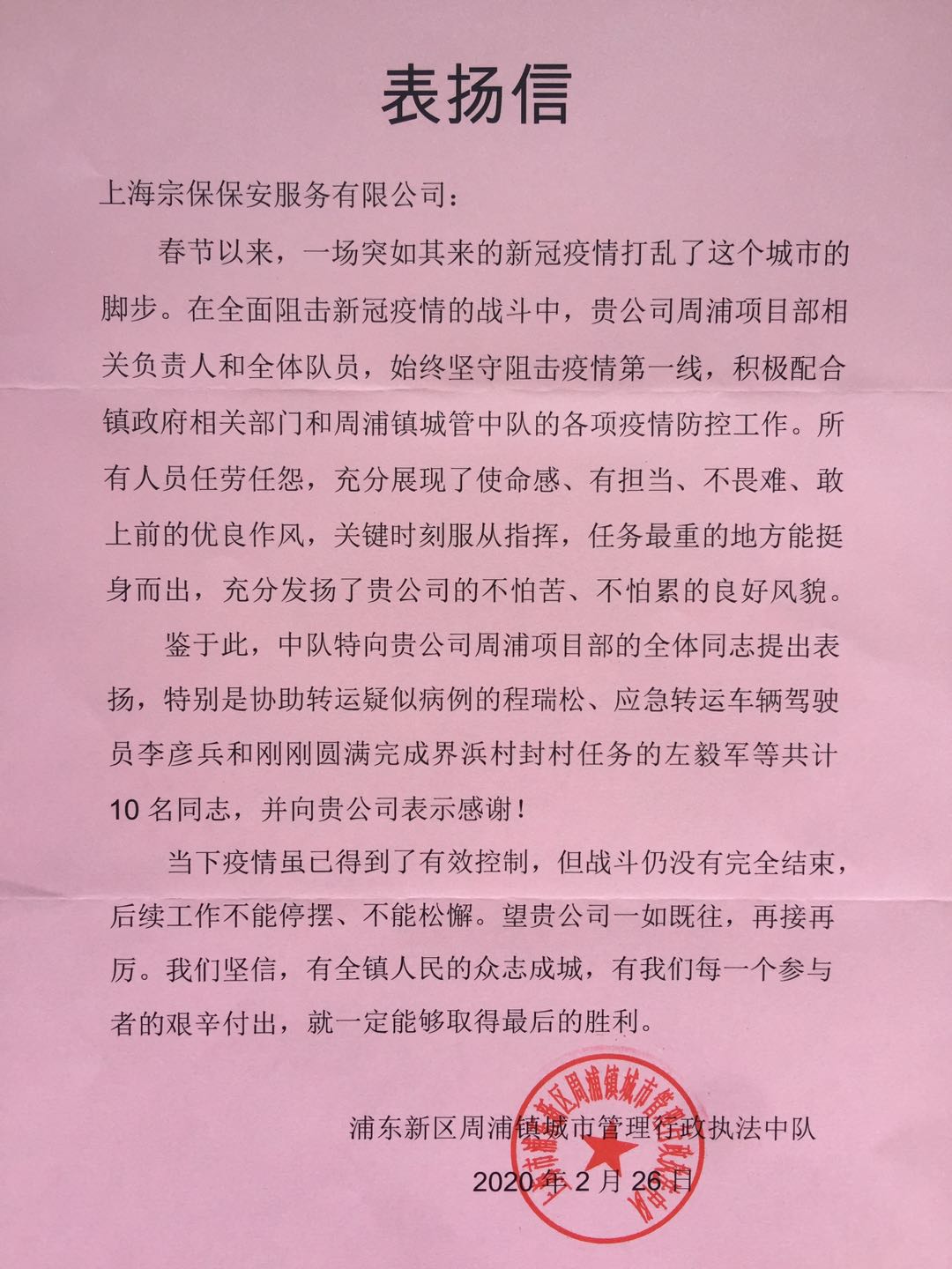 2月26日,浦東新區周浦鎮城管中隊送來(lái)表?yè)P信,表?yè)P公司駐周浦市容項目全體隊員在疫情防控中的工作表現,特別對協(xié)助轉運疑似病例的程瑞松、應急轉運車(chē)輛駕駛員李彥兵、圓滿(mǎn)完成界浜村封村任務(wù)的左毅軍等10名隊員重點(diǎn)表?yè)P。
