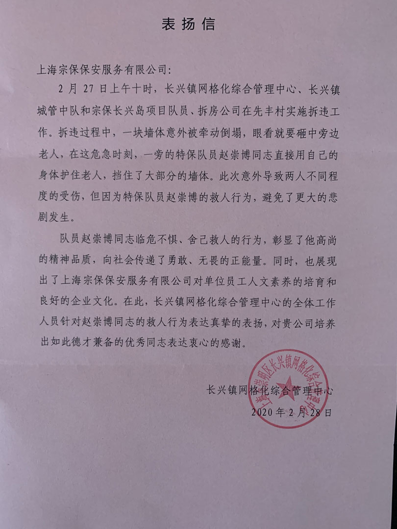 2月28日,宗保公司收到崇明區長(cháng)興鎮網(wǎng)格化管理中心送來(lái)的表?yè)P信,高度贊揚公司駐長(cháng)興島城管項目隊員趙崇博在拆違過(guò)程中臨危不懼、舍己救人的行為。