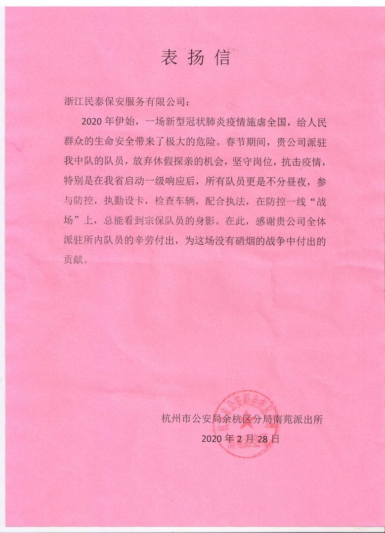 2月28日,浙江民泰公司收到杭州市公安局余杭區分局南苑派出所送來(lái)的表?yè)P信,贊揚公司駐該所項目隊員在疫情防控中的工作表現,感謝隊員們的辛勤付出。