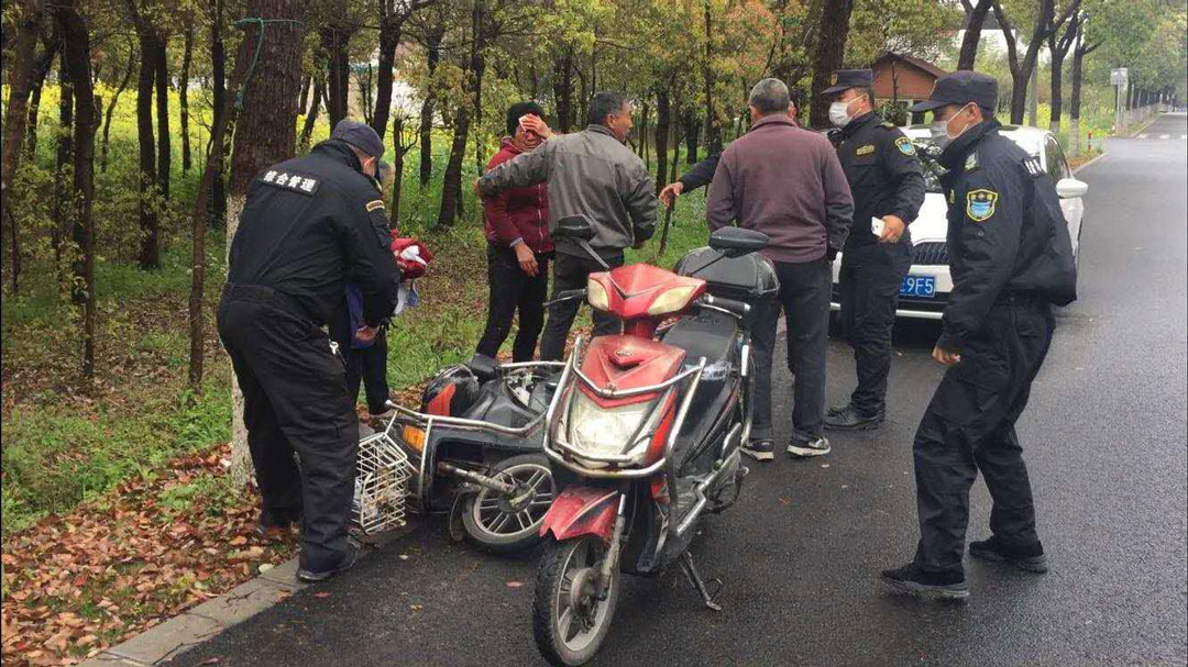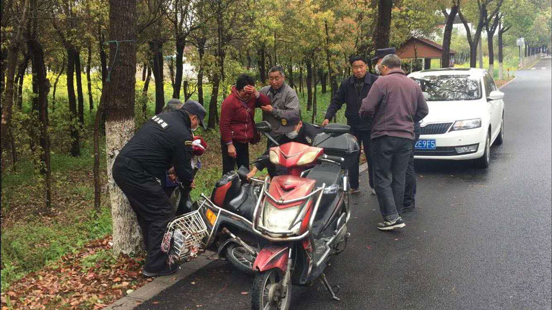 3月28日11:20,剛下過(guò)雨路面濕滑。宗保公司駐金山衛市容項目張建華、孫傳奇、王振鵬、李凱、李昆鵬等隊員在去上班的路上,看到一位老人摔倒在馬路邊,電動(dòng)車(chē)壓在老人身上。該老人額頭有些擦傷,手捂著(zhù)額頭一時(shí)間無(wú)法起身。