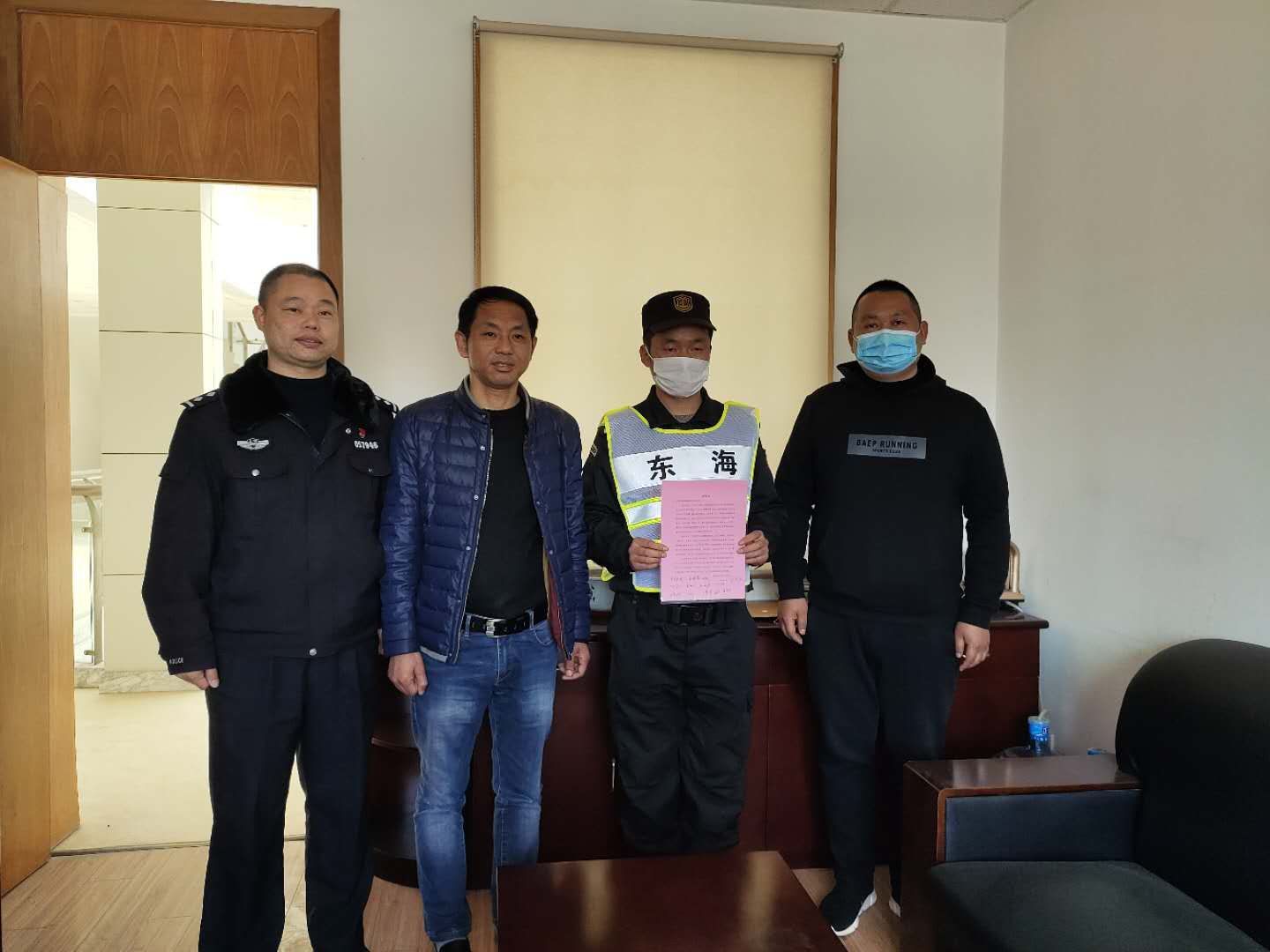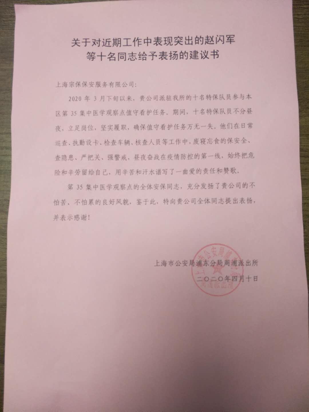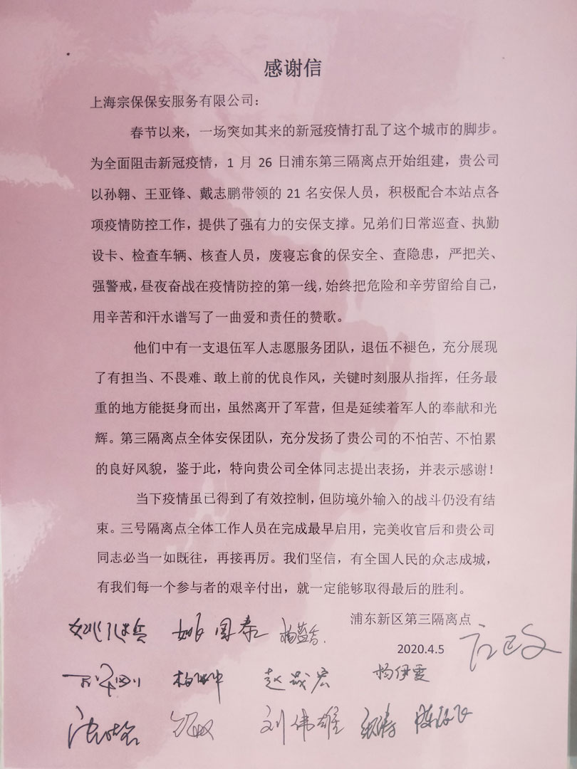 4月10日,宗保公司駐周浦輔警項目收到甲方的感謝信,信中對參與35號集中醫學(xué)觀(guān)察點(diǎn)的趙閃軍等10名保安員提出表?yè)P并表示感謝。