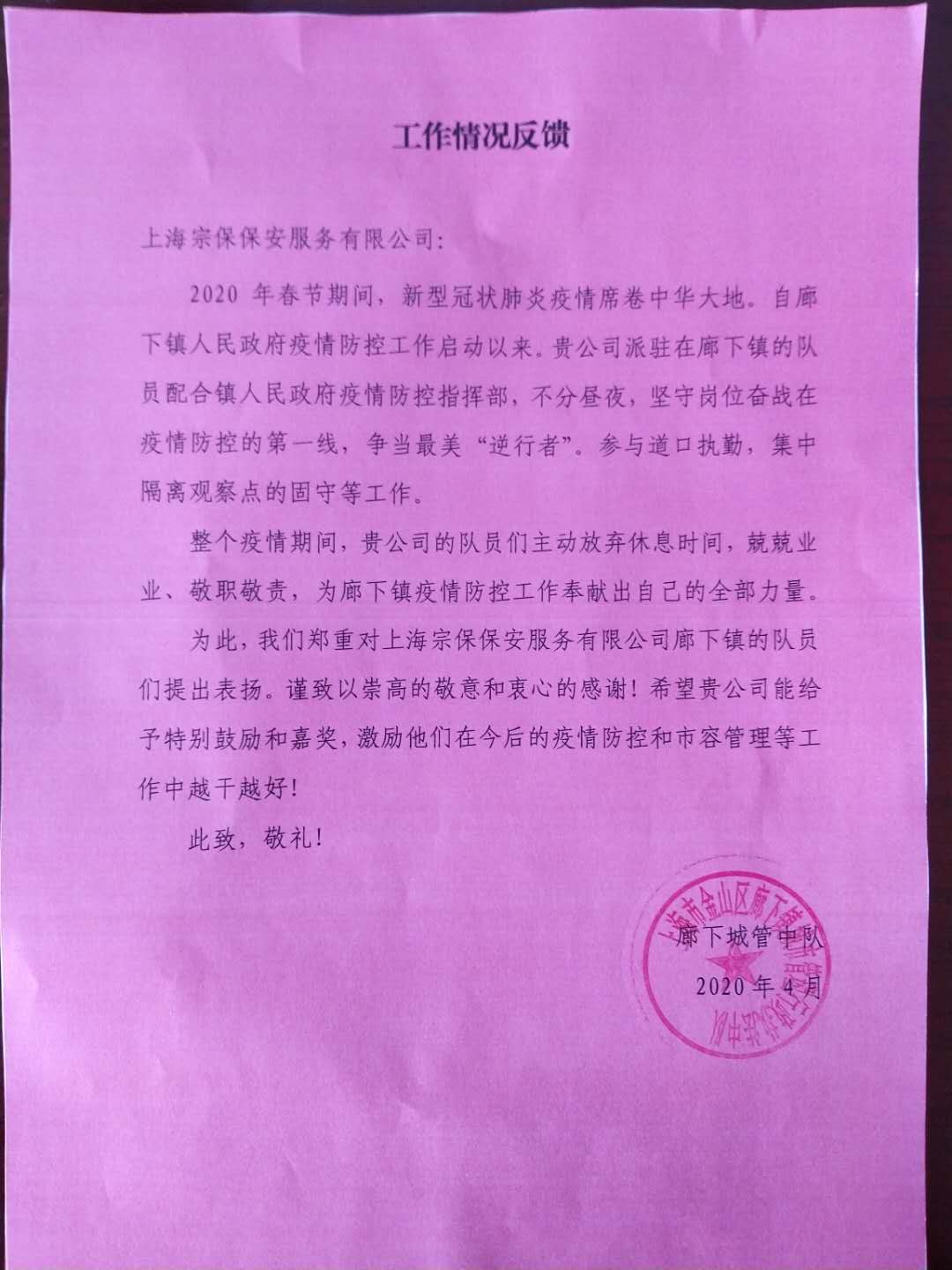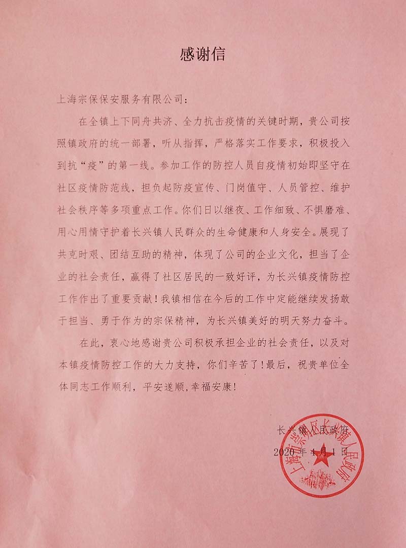 4月1日,宗保公司駐長(cháng)興鎮市容項目收到甲方送來(lái)的感謝信,信中對該項目全體隊員在參與疫情防控中所做的工作表示感謝。