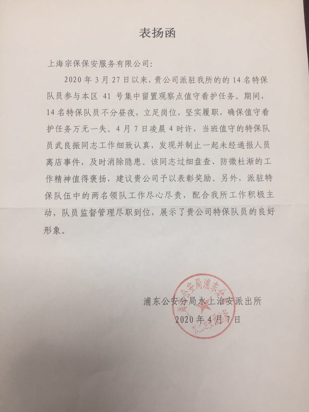 4月7日,宗保公司駐周浦輔警項目收到浦東新區水上治安派出所送來(lái)的表?yè)P函。
