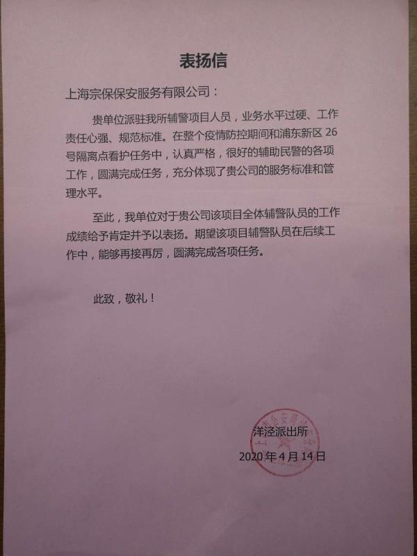 4月14日,宗保公司收到洋涇派出所送來(lái)的表?yè)P信。信中對公司駐該所輔警項目參與第26號集中隔離點(diǎn)保障工作情況給予肯定和表?yè)P。