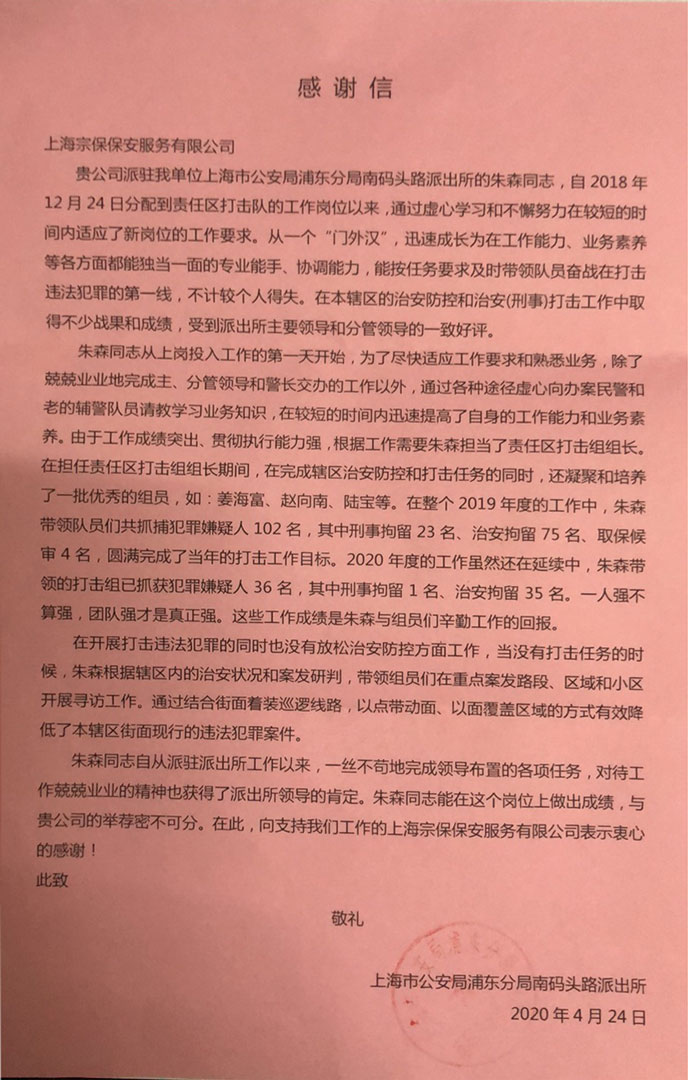 4月24日,宗保公司駐南碼頭派出所輔警項目收到浦東新區南碼頭派出所送來(lái)的感謝信,信中對該項目責任區打擊組組長(cháng)朱森提出特別表?yè)P。