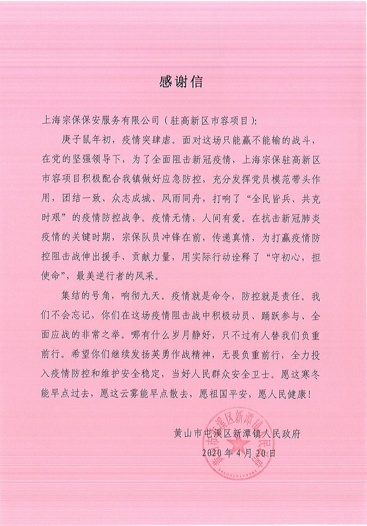 4月20日,宗保公司駐黃山市高新區市容項目收到黃山市屯溪區新潭鎮人民政府送來(lái)的一封感謝信,信中對高新區市容項目全體隊員在疫情防控中所做的工作表示感謝。