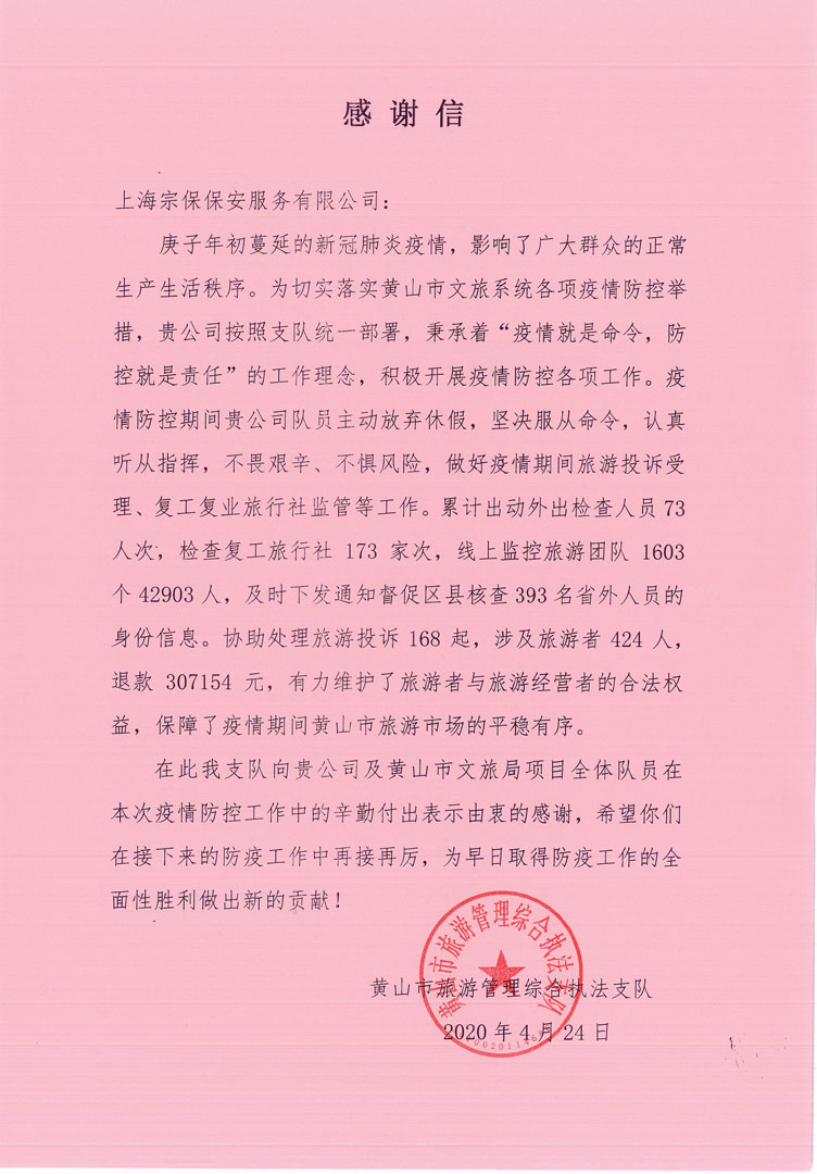 4月24日,宗保公司駐黃山市旅游管理綜合項目收到黃山市旅游管理綜合執法支隊的感謝信。