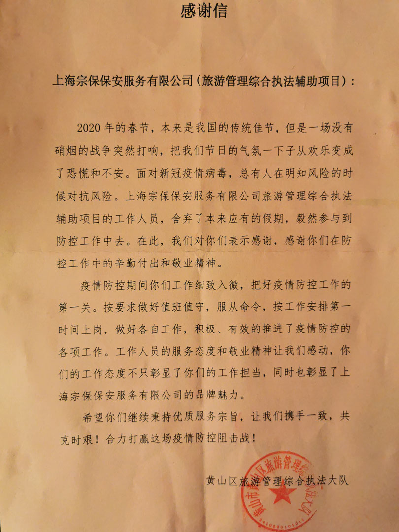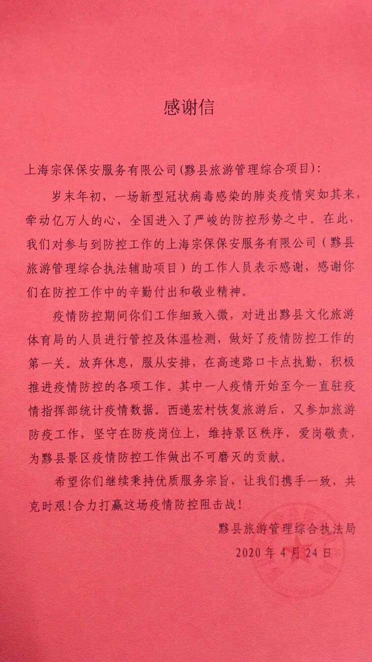 4月24日,宗保公司駐黃山市黟縣旅游管理綜合項目收到黟縣旅游管理綜合執法局的一封感謝信,信中對公司全體隊員在疫情防控工作中的辛勤付出和敬業(yè)精神表示感謝。