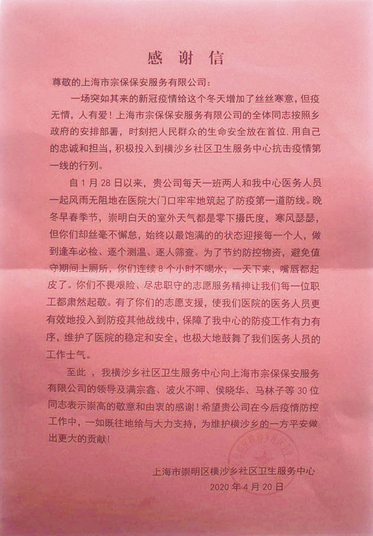 4月25日,宗保公司收到浦東新區張江鎮人民政府的感謝信。信中對宗保公司以善行擔起守望相助的社會(huì )責任,用義舉筑起抗擊疫情的家園情懷,表示感謝和敬意!