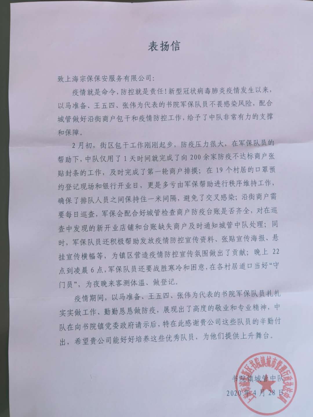4月28日,宗保公司駐書(shū)院鎮市容項目收到書(shū)院鎮城管中隊中隊長(cháng)王燕偉送來(lái)的一封表?yè)P信,信中對以馬準備、王五四、張偉等為代表的書(shū)院鎮市容項目隊員,在防控新冠肺炎疫情中配合城管中隊所做的工作,提供的有力支撐和保障提出表?yè)P。