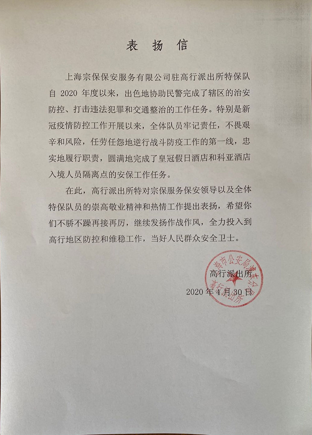 4月30日,高行輔警項目收到浦東公安分局高行派出所送來(lái)的一封表?yè)P信,信中對高行輔警項目全體隊員在疫情防控中的努力和辛勤付出提出表?yè)P。