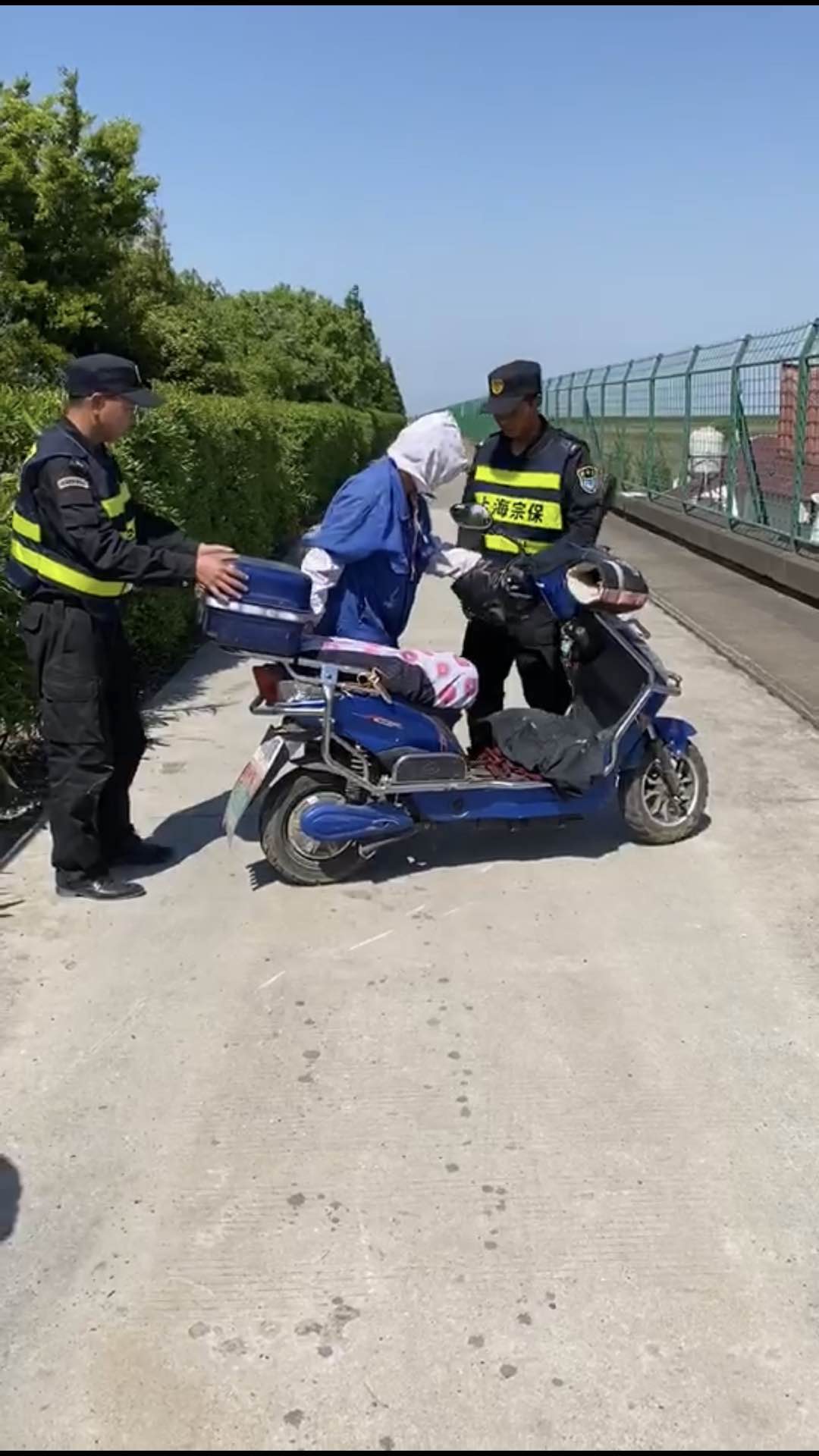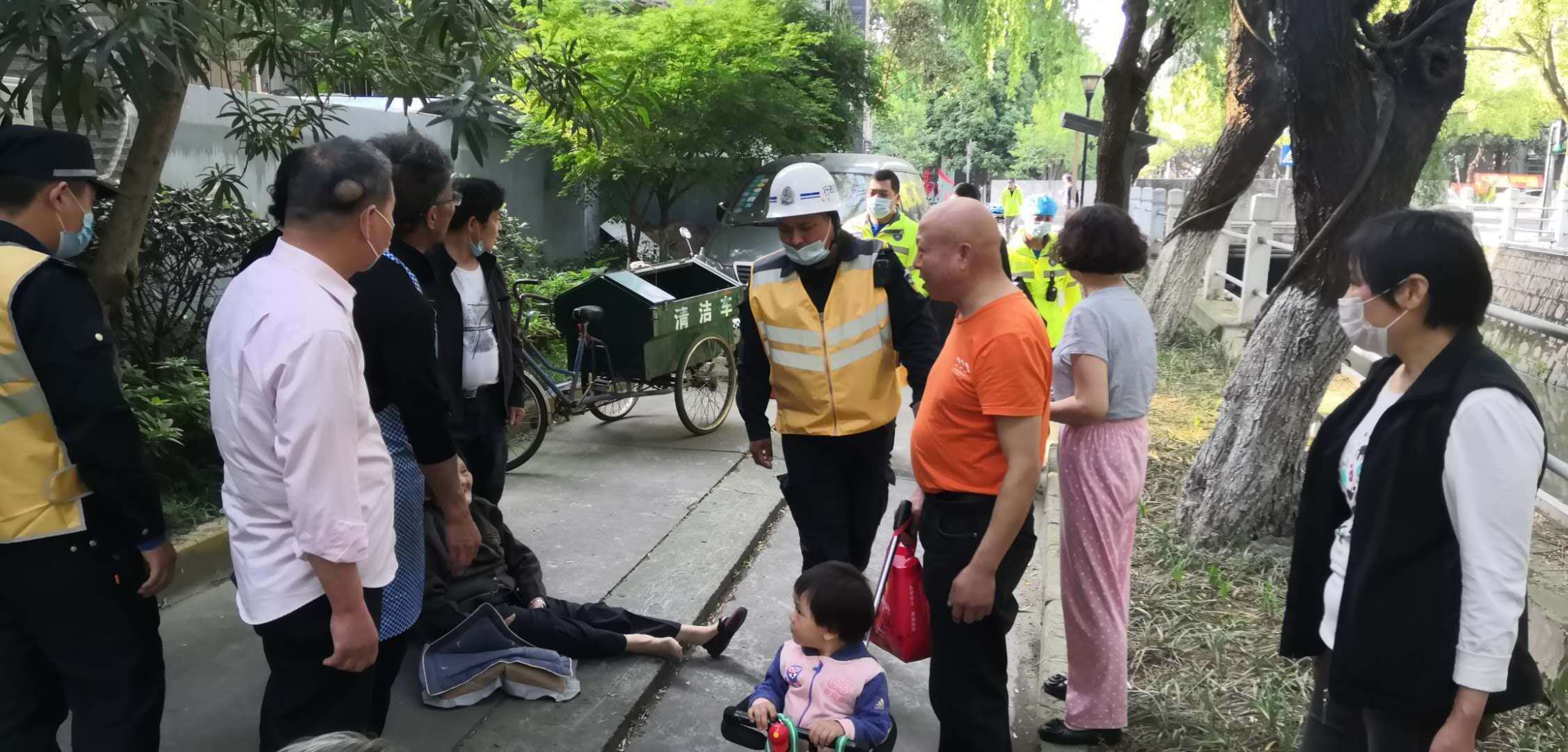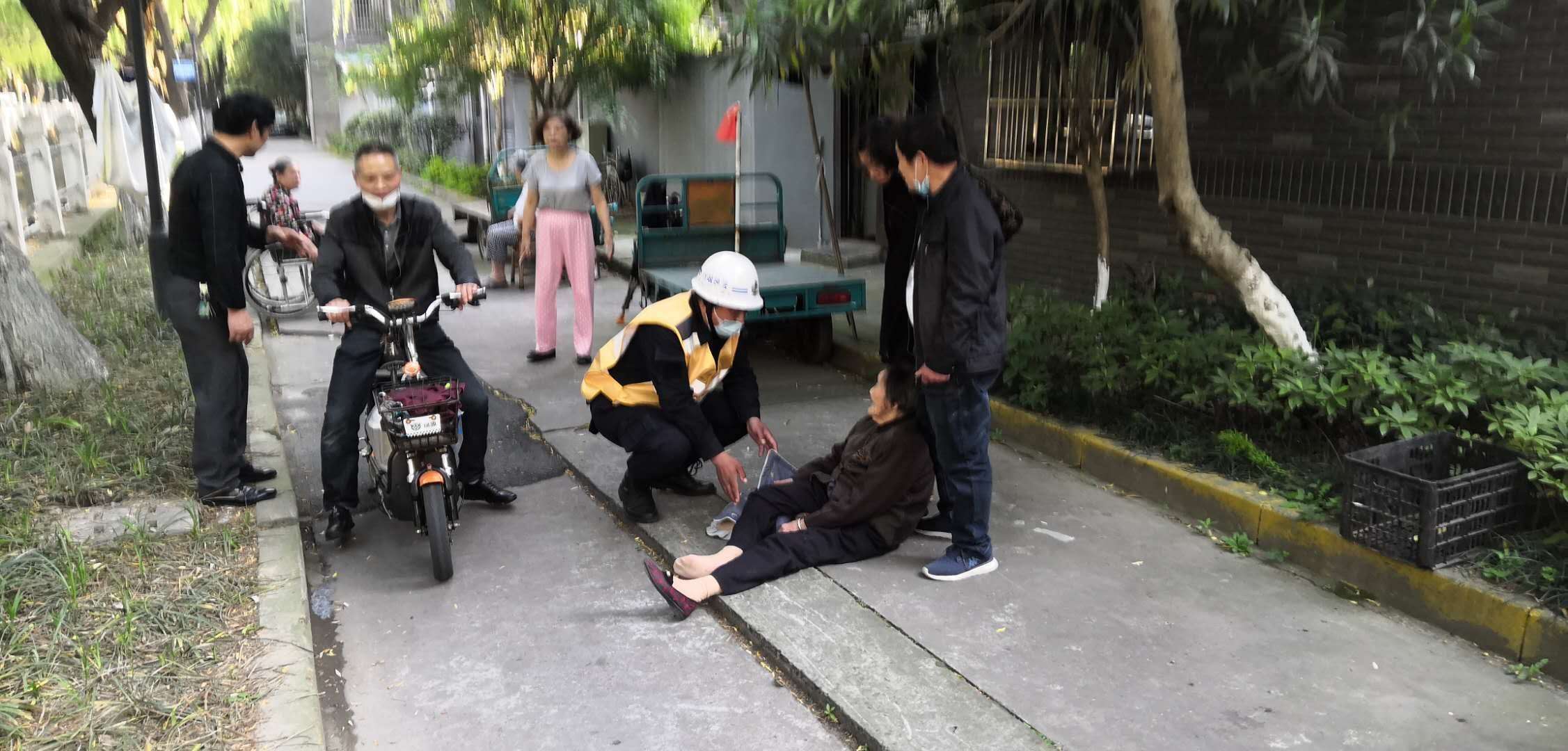 4月28日14:15,該項目隊員倪進(jìn)杉與楊奕林在地塊南門(mén)口執勤巡邏,看到一位老阿姨騎電瓶車(chē)不慎摔倒在地,立即上前查看情況?!耙凰は氯?,我整個(gè)人都懵掉了,根本沒(méi)有辦法起來(lái),這條路很少有人經(jīng)過(guò),多虧你們?!痹瓉?lái)阿姨著(zhù)急去田里干農活,結果連人帶車(chē)摔倒了。小倪和小楊將阿姨扶起,得知阿姨無(wú)大礙后,繼續投入到緊張的工作中。