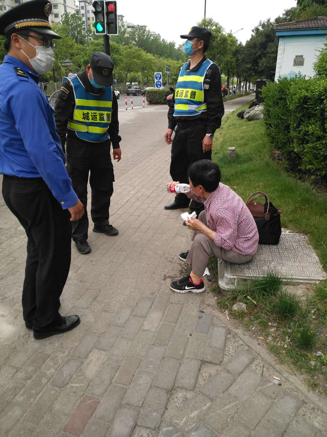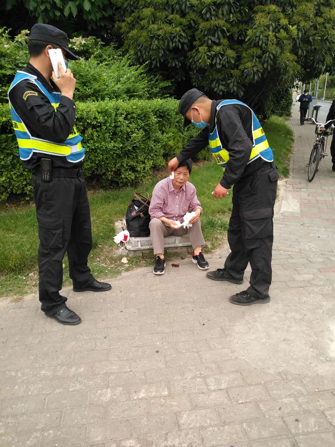 5月14日15:30左右,宗保公司駐南碼頭市容項目隊員甘文兵、楊召群巡查至楊高南路東三里橋路交叉口時(shí),發(fā)現一位老人坐在路邊,臉上有斑斑血跡,老人只是機械性地擦著(zhù)臉上的血,而周?chē)鷣?lái)來(lái)往往的人卻熟視無(wú)睹,事不關(guān)己,無(wú)人施以援手給予幫助。