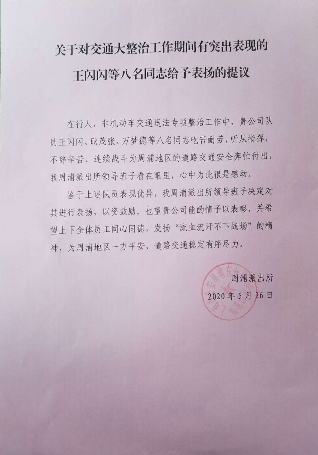 5月26日,宗保公司駐周浦派出所輔警項目收到甲方表?yè)P信。信中對在行人、非機動(dòng)車(chē)交通違法專(zhuān)項整治活動(dòng)中,表現優(yōu)秀的王閃閃、耿茂張、萬(wàn)夢(mèng)德等八名隊員提出特別表?yè)P。