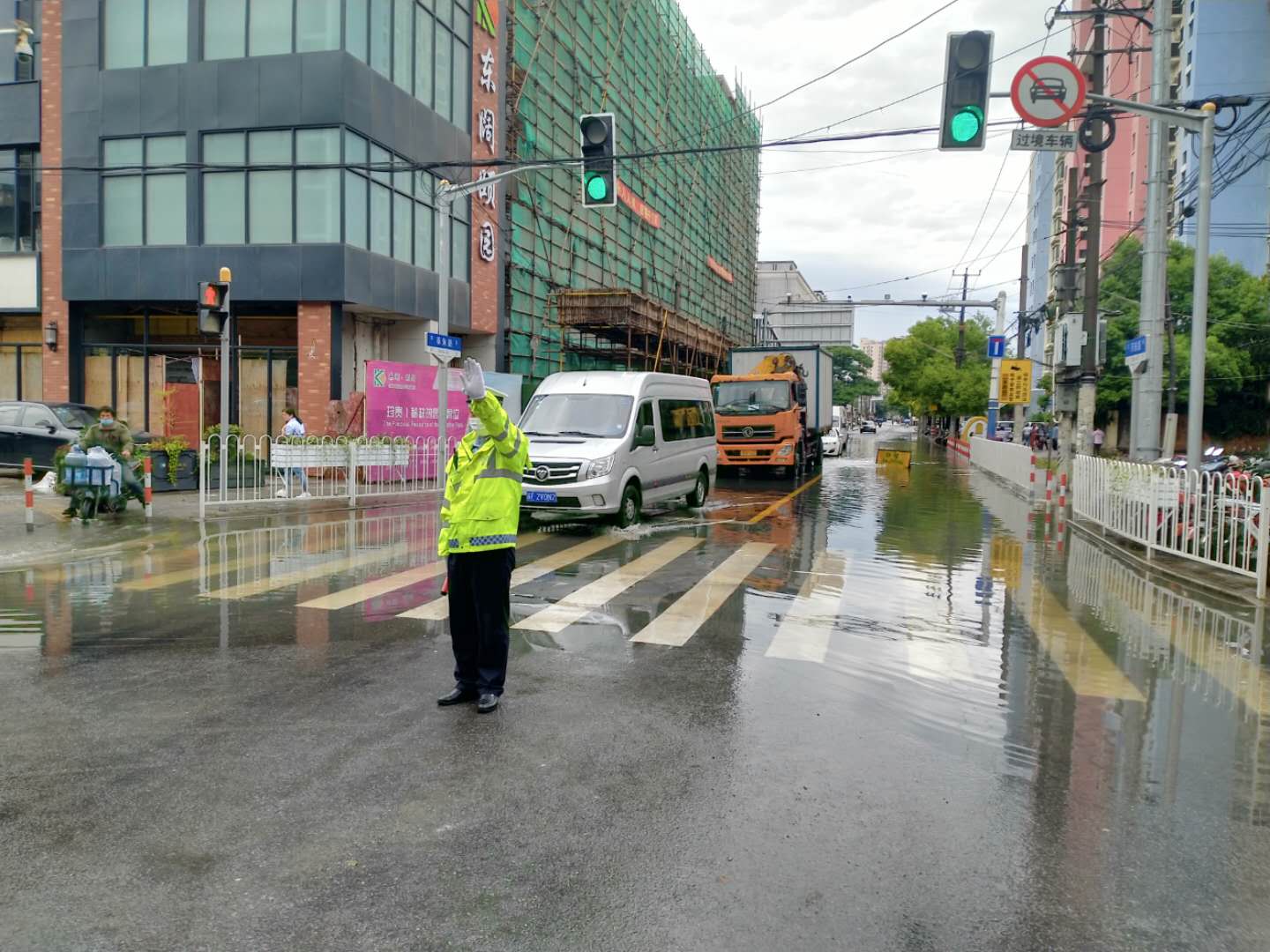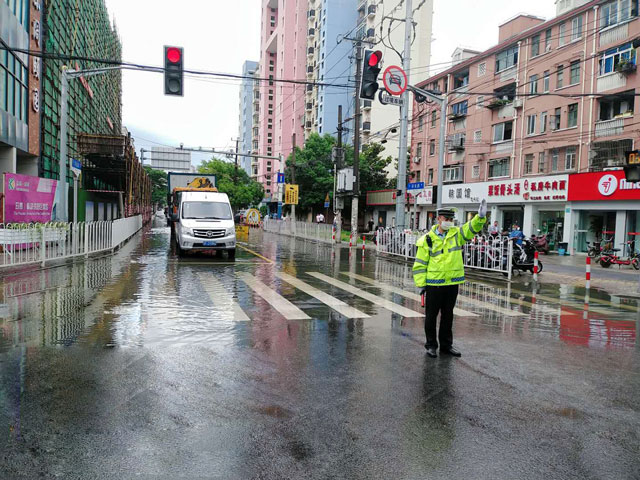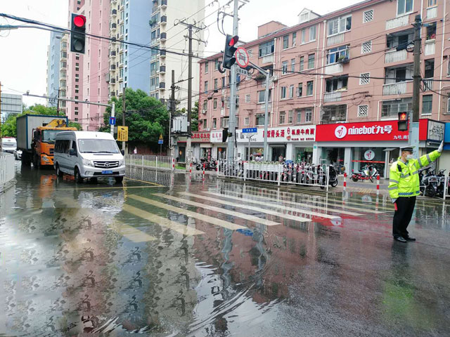 宗保公司駐莘莊梅隴交通輔警項目隊員李曉龍,暴雨中堅守崗位,不顧雨水澆身,配合交警鎮定指揮,疏導交通排堵保暢,及時(shí)引導車(chē)輛避免駛入積水路段,確保了道路交通安全。