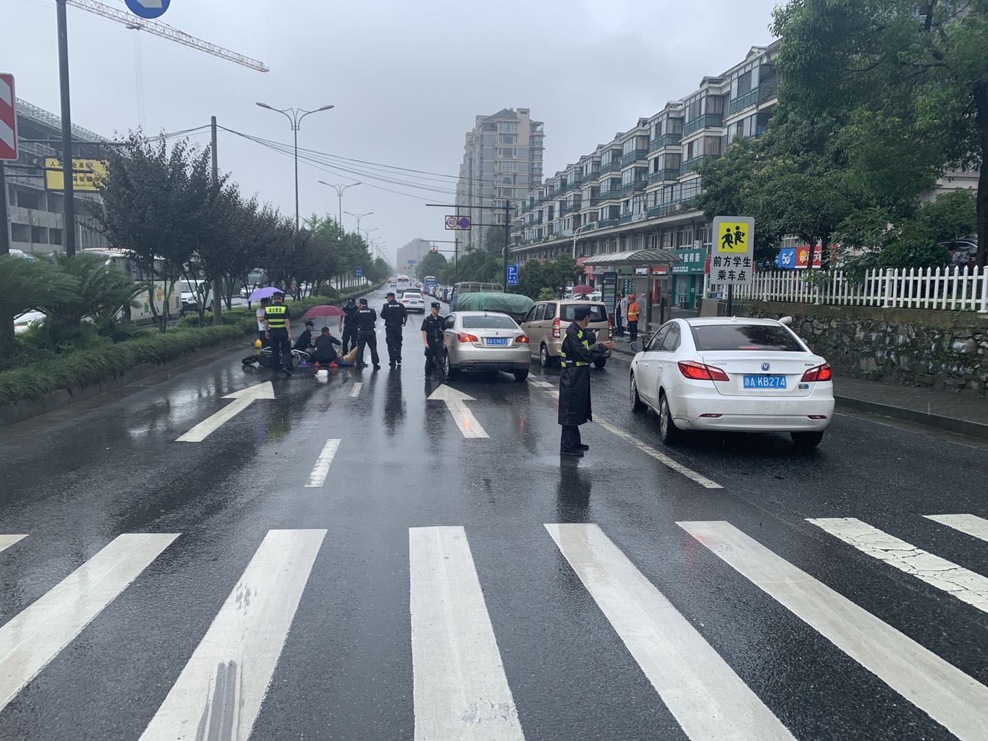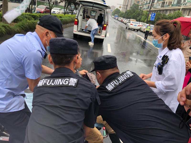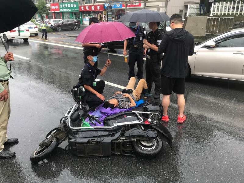 當日天空下著(zhù)小雨,路面濕滑。電瓶車(chē)車(chē)主是位阿姨,躺在濕冷的馬路上,身上多處受傷無(wú)法動(dòng)彈,自己也被這突如其來(lái)的事故嚇得驚慌失措。為避免發(fā)生二次交通事故,楊有福和郭文凱見(jiàn)狀立即進(jìn)行現場(chǎng)警戒。郭文凱指揮過(guò)往車(chē)輛和圍觀(guān)人群,進(jìn)行交通疏導。楊有福細心地詢(xún)問(wèn)阿姨的受傷情況,撥打120急救電話(huà)和110報警電話(huà)。在等待醫護人員趕往事故現場(chǎng)的同時(shí),楊有福則一直俯下身子給阿姨撐傘遮雨。