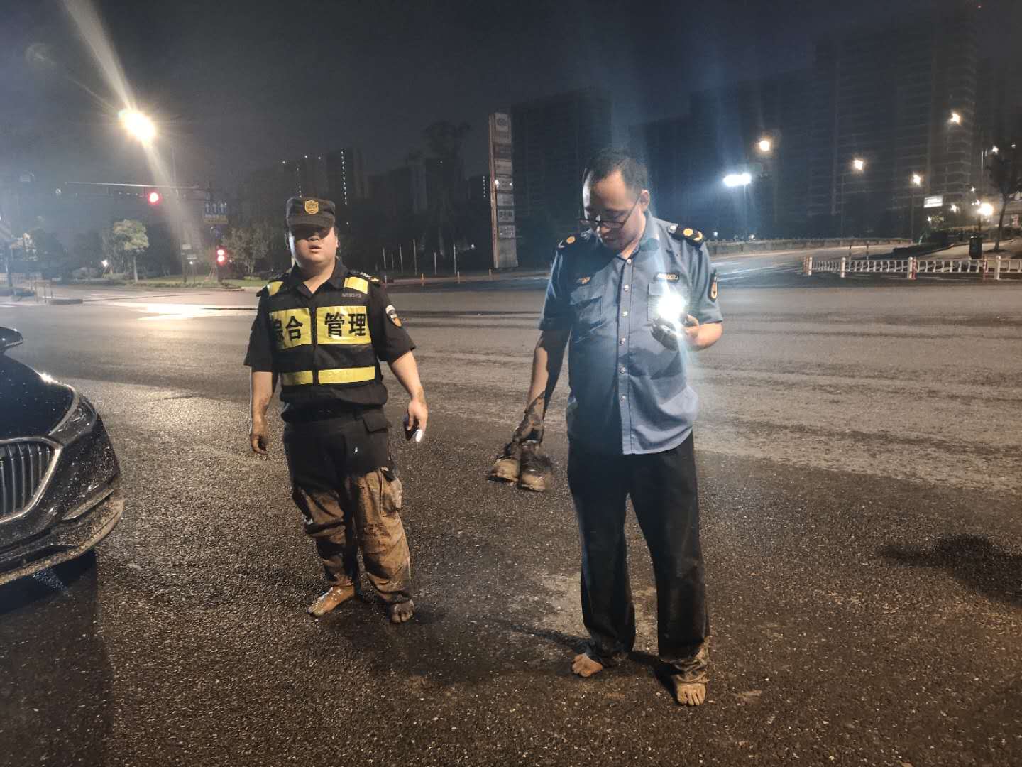 當天凌晨1點(diǎn),該項目夜班隊員溫東興、蔣超、王園召在巡查期間接到舉報電話(huà),有人在附近路邊傾倒工程渣土。三人立即將此事匯報城管中隊領(lǐng)導,在相關(guān)領(lǐng)導的帶領(lǐng)下隨即趕赴事發(fā)現場(chǎng),發(fā)現當事人正準備駕車(chē)逃離。由于近期雨水多,路面嚴重泥濘,違規渣土車(chē)行駛緩慢。三名隊員立刻下車(chē),不顧泥濘,不管滿(mǎn)身泥漿,鞋子陷入泥中就赤腳,深一腳淺一腳地奮力追趕,最終在三人的努力下,成功地將涉事人員和車(chē)輛控制。