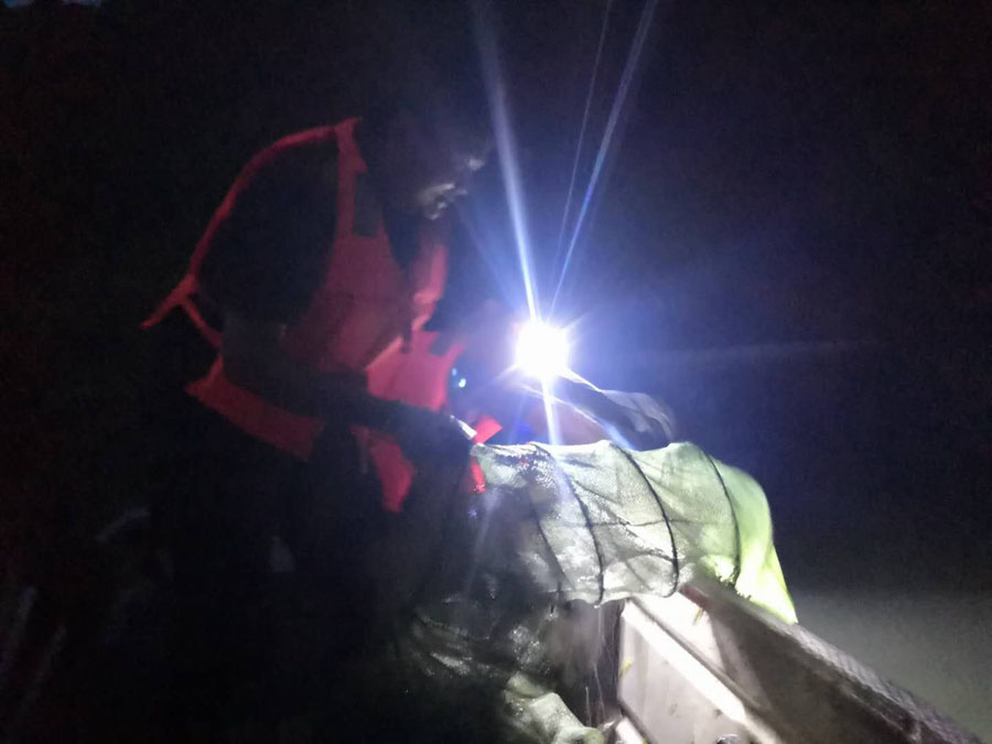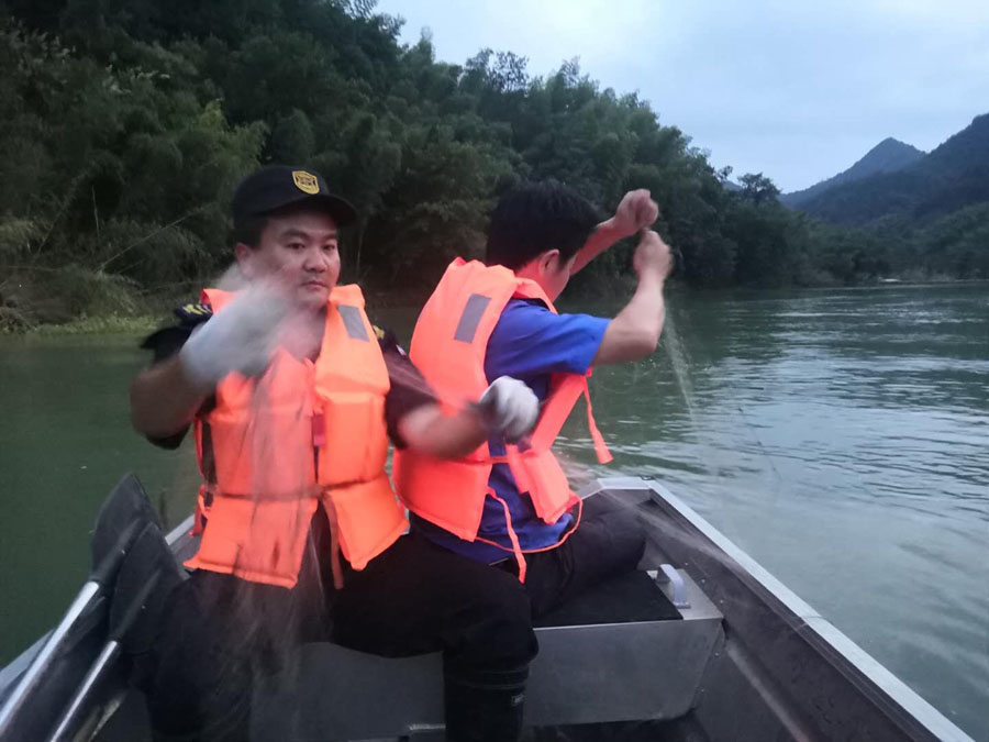 汛期洪水過(guò)后,齊云山轄區橫江流域水位迅速下降,附近漁民趁機下網(wǎng)布籠進(jìn)行非法捕撈。為保護橫江生態(tài)環(huán)境,在齊云山景區管委會(huì )的組織和帶領(lǐng)下,宗保隊員于7月14日18:00和15日凌晨3:00兩次出擊,在齊云山轄區橫江水域協(xié)助執法部門(mén)打撈并收繳地籠20多副、魚(yú)網(wǎng)30多副。