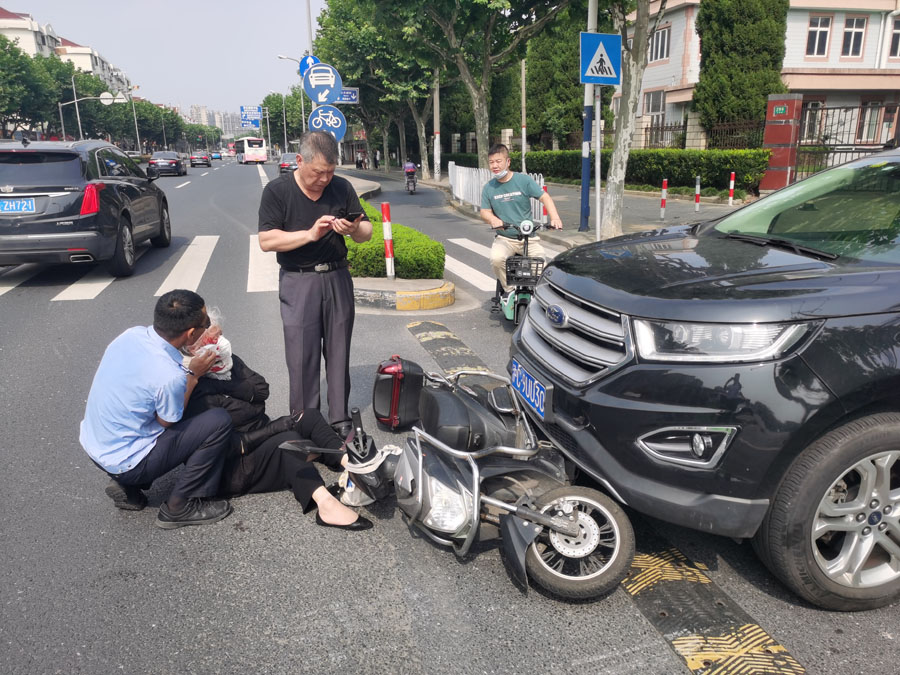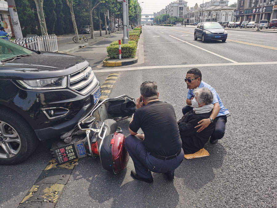 7月22日14時(shí),閔行莘莊梅隴交通輔警鄭德坡和經(jīng)理周鹍經(jīng)過(guò)春莘路時(shí),發(fā)現路邊發(fā)生一起交通事故。機動(dòng)車(chē)與非機動(dòng)車(chē)相撞,被撞的老人坐在地上,滿(mǎn)臉是血。兩人見(jiàn)狀迅速調轉車(chē)頭,將車(chē)在路邊停好后,上前查看老人受傷情況,用手機拍攝現場(chǎng)照片,一同指揮車(chē)輛不要妨礙交通。
