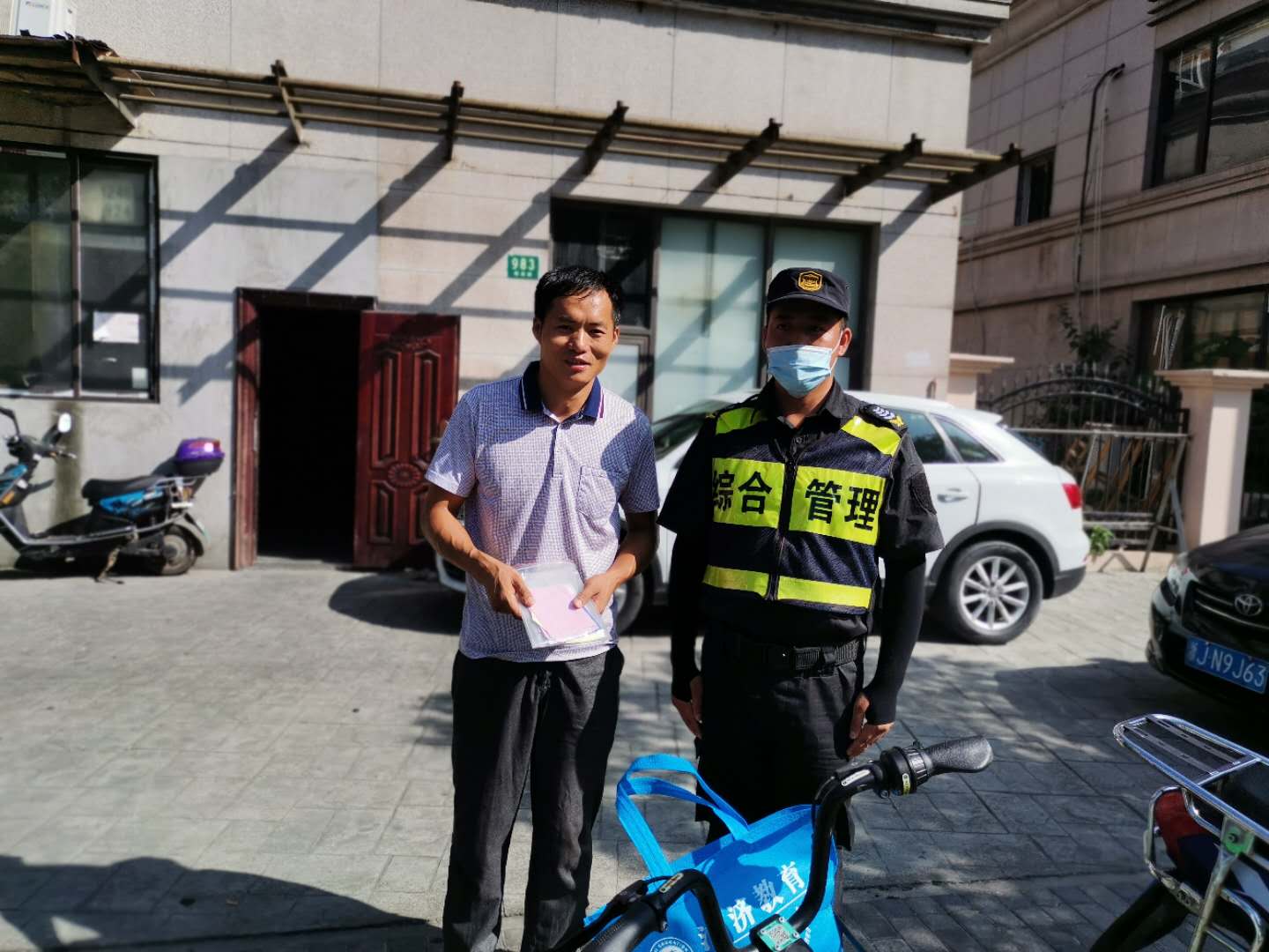 8月20日9:00左右,宗保公司駐三林城管輔助隊員李斌在板泉路980號門(mén)口整理共享單車(chē)時(shí),發(fā)現一輛車(chē)籃子里放著(zhù)一個(gè)文件袋,里面裝有一份購車(chē)合同、身份證、銀行卡和房門(mén)鑰匙等物品。