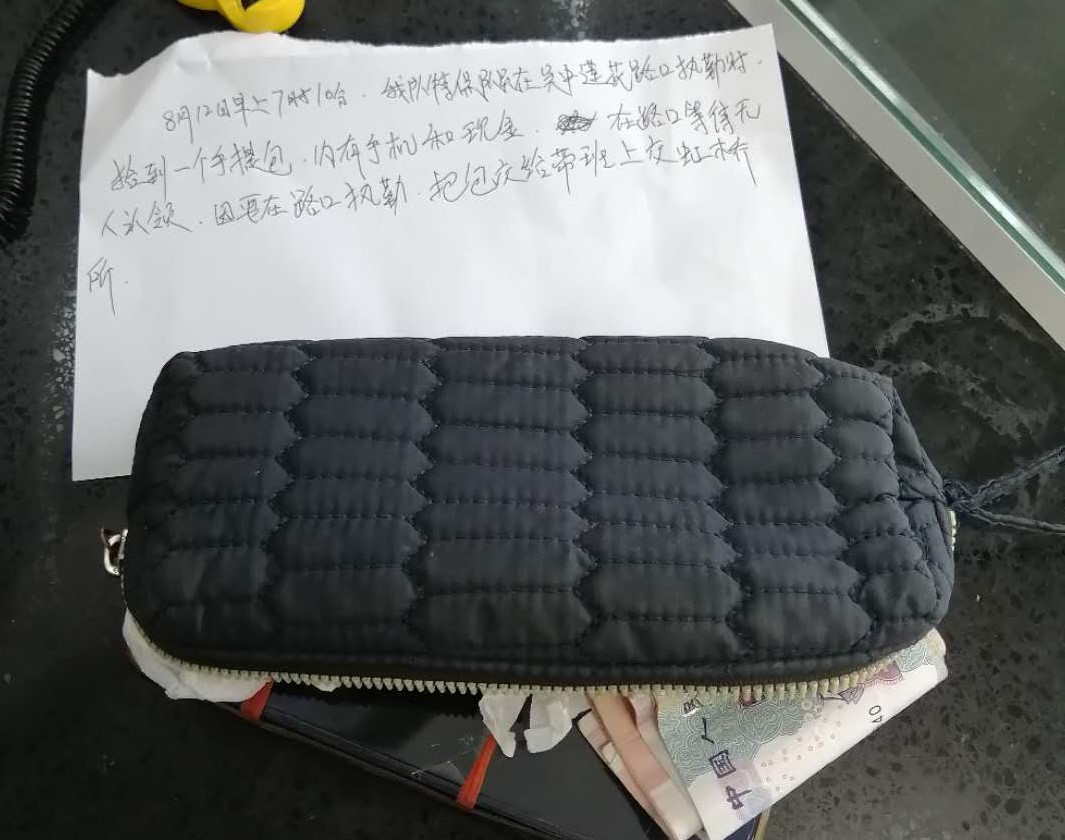 8月12日7:10,宗保公司駐閔行交通輔警項目隊員范成剛,在吳中路蓮花路路口執勤時(shí)撿到一個(gè)手包,包內有手機、現金等物品。