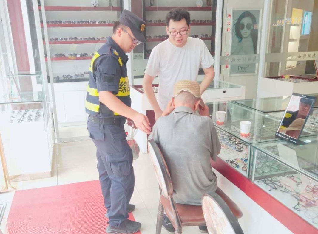 當日11:30左右,一位在街道上徘徊了許久的老人,無(wú)奈地走進(jìn)眼鏡店求助。眼鏡店老板見(jiàn)狀安慰老人,這時(shí)恰逢巡邏隊員文英杰、徐飛、張侯鵬在路邊巡邏,就向隊員尋求幫助。
