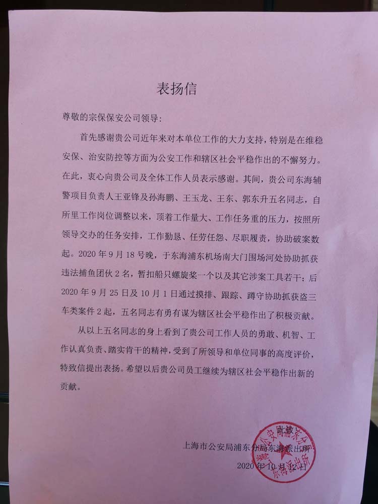10月12日,上海宗保保安服務(wù)有限公司收到東海派出所送來(lái)的表?yè)P信,信中對惠祝區域東海輔警項目隊員王亞峰、孫海鵬、王玉龍、王東、郭東升五名同志任勞任怨、盡職盡責的工作態(tài)度給予了充分肯定和贊揚。