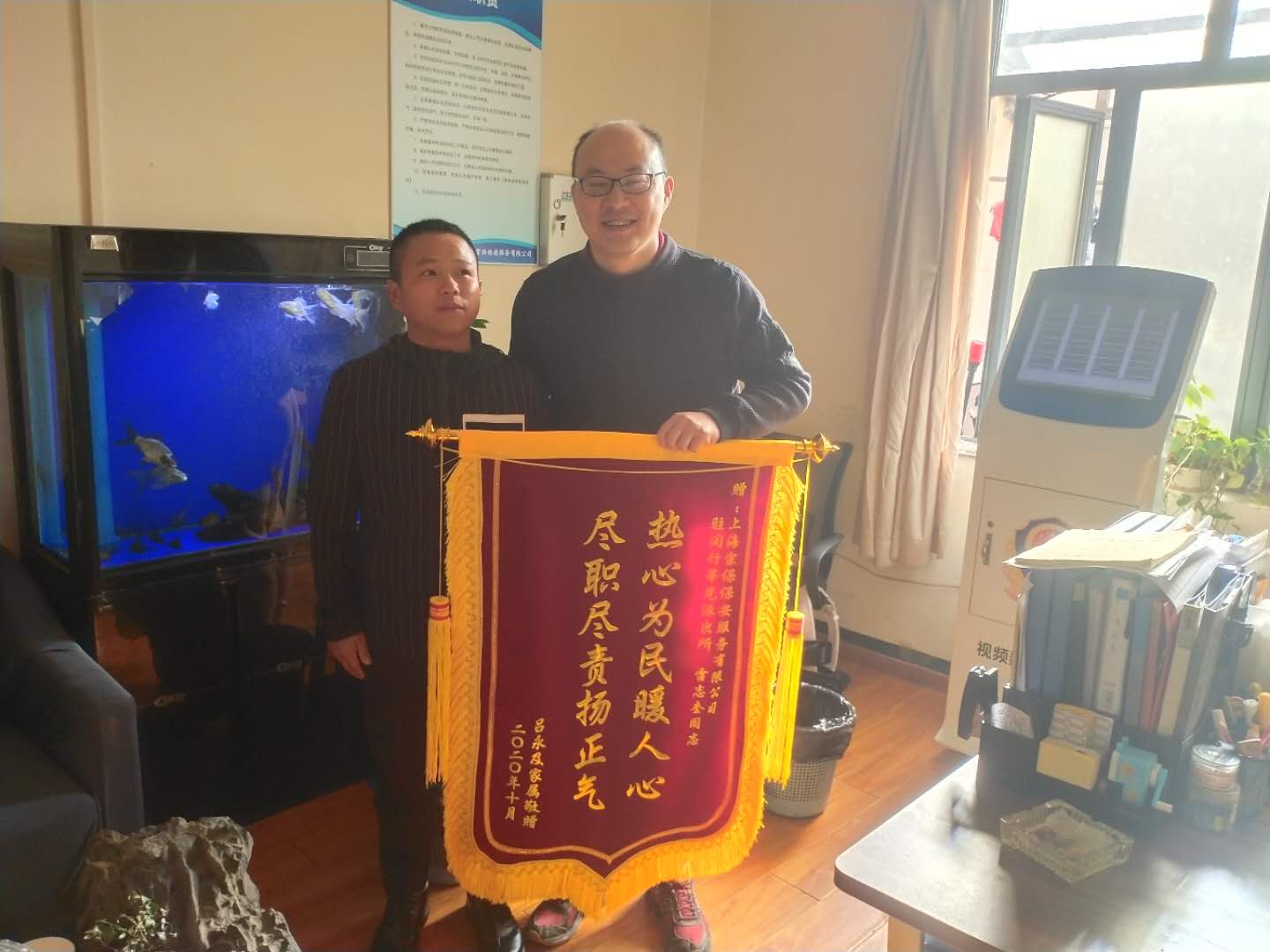 10月25日,一面繡有“熱心為民暖人心,盡職盡責揚正氣”的錦旗送到了宗保公司駐閔行莘莊梅隴交管輔警項目隊員雷志奎的手中。