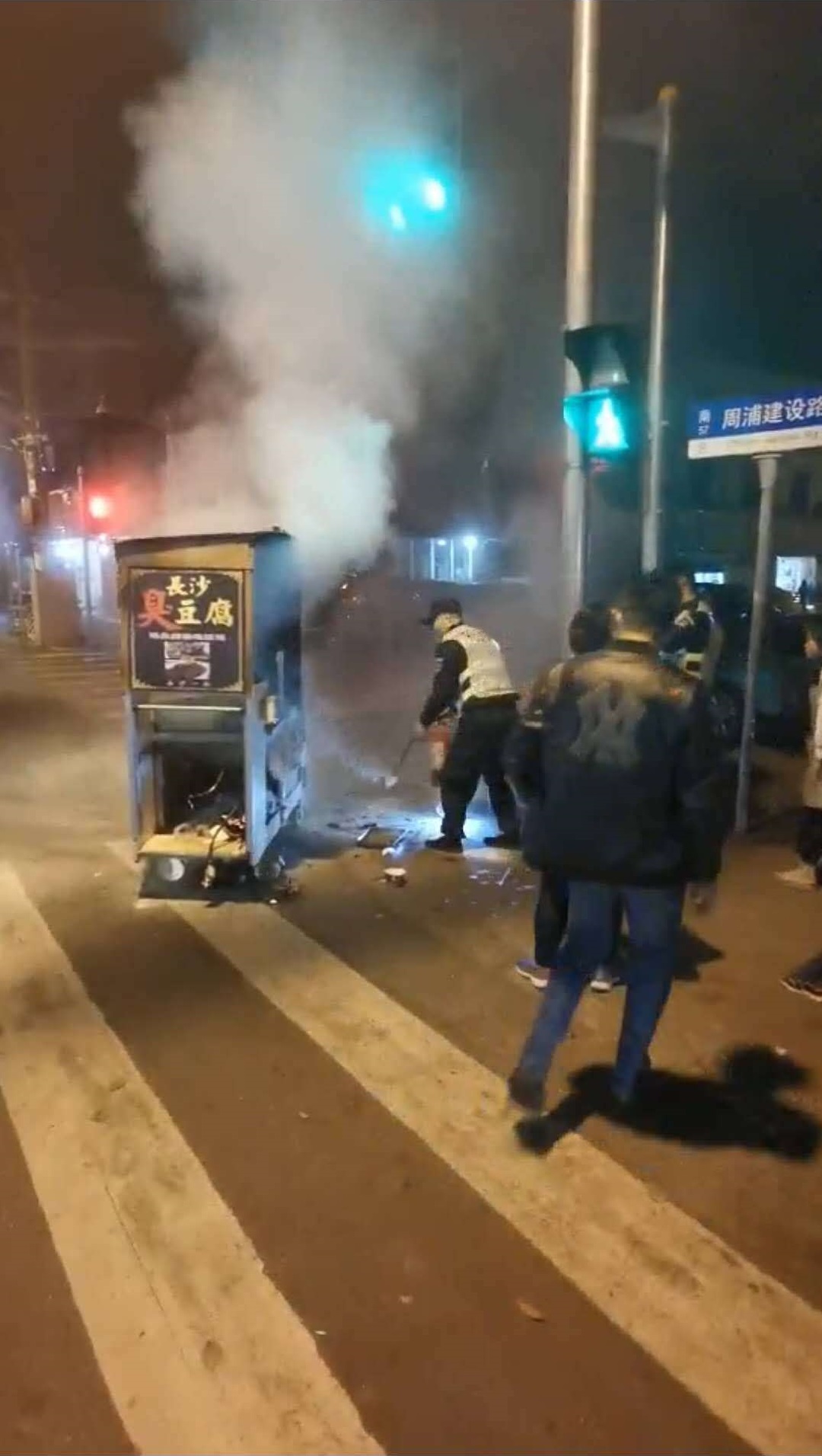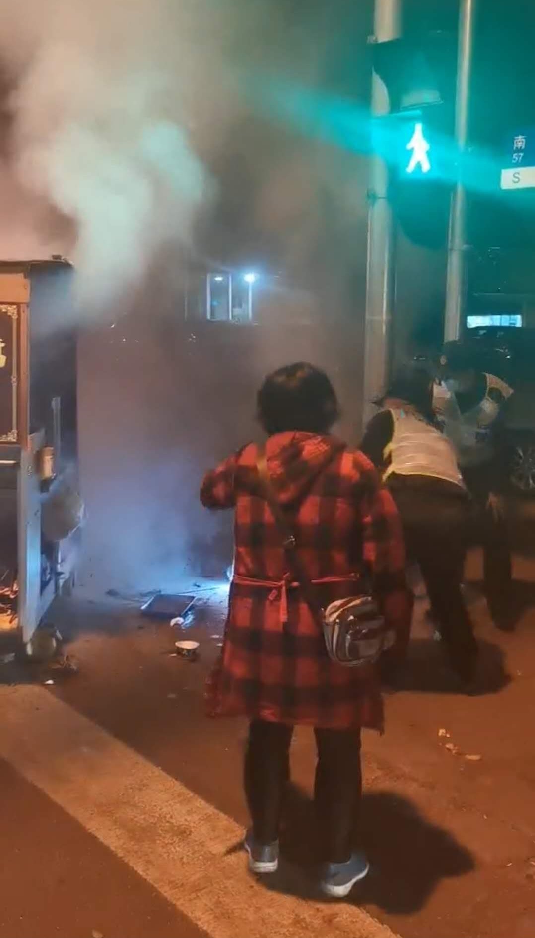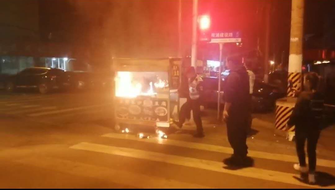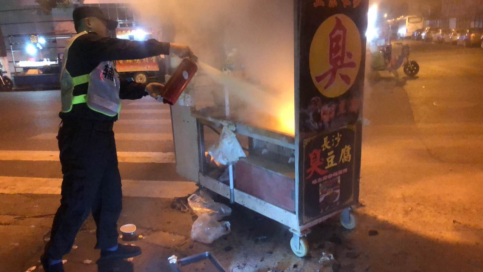 當天23:00左右,徐建、程亮巡邏至瓦屑建設路振興路路口時(shí),看到一流動(dòng)攤位車(chē)起火,冒著(zhù)濃煙,一個(gè)小孩子站在攤位旁邊不知所措。徐建和程亮立即上前,將周?chē)罕娛枭㈤_(kāi),遠離著(zhù)火點(diǎn),并快速找來(lái)滅火器將火熄滅。