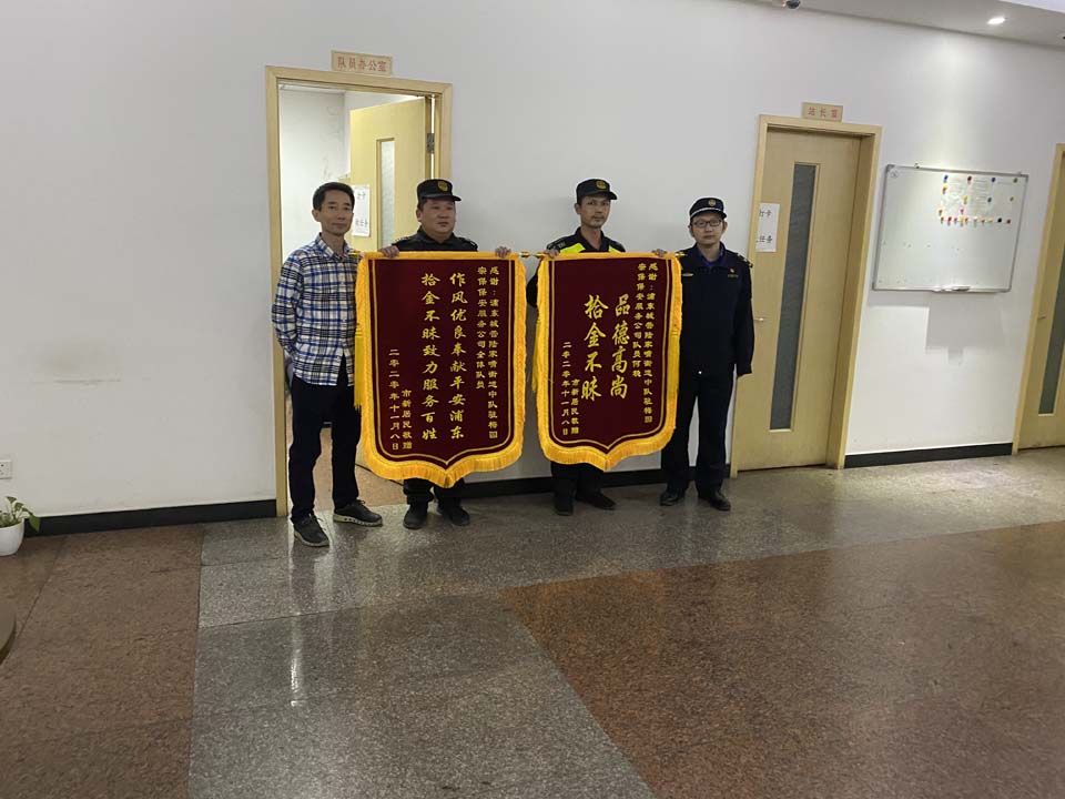 事后,馮先生特地來(lái)到陸家嘴街道城管中隊,將繡有“拾金不昧 品德高尚”“拾金不昧致力服務(wù)百姓 作風(fēng)優(yōu)良奉獻平安浦東”的兩面錦旗和一封熱情洋溢的感謝信送到何穩手中,以表達謝意。
