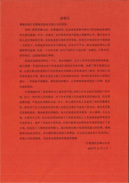 11月3日,浙江民泰駐星橋街道項目收到一封橫山村村民送來(lái)的感謝信,信中對項目隊員朱德剛認真負責的工作態(tài)度和樂(lè )于助人的奉獻精神給予充分肯定。